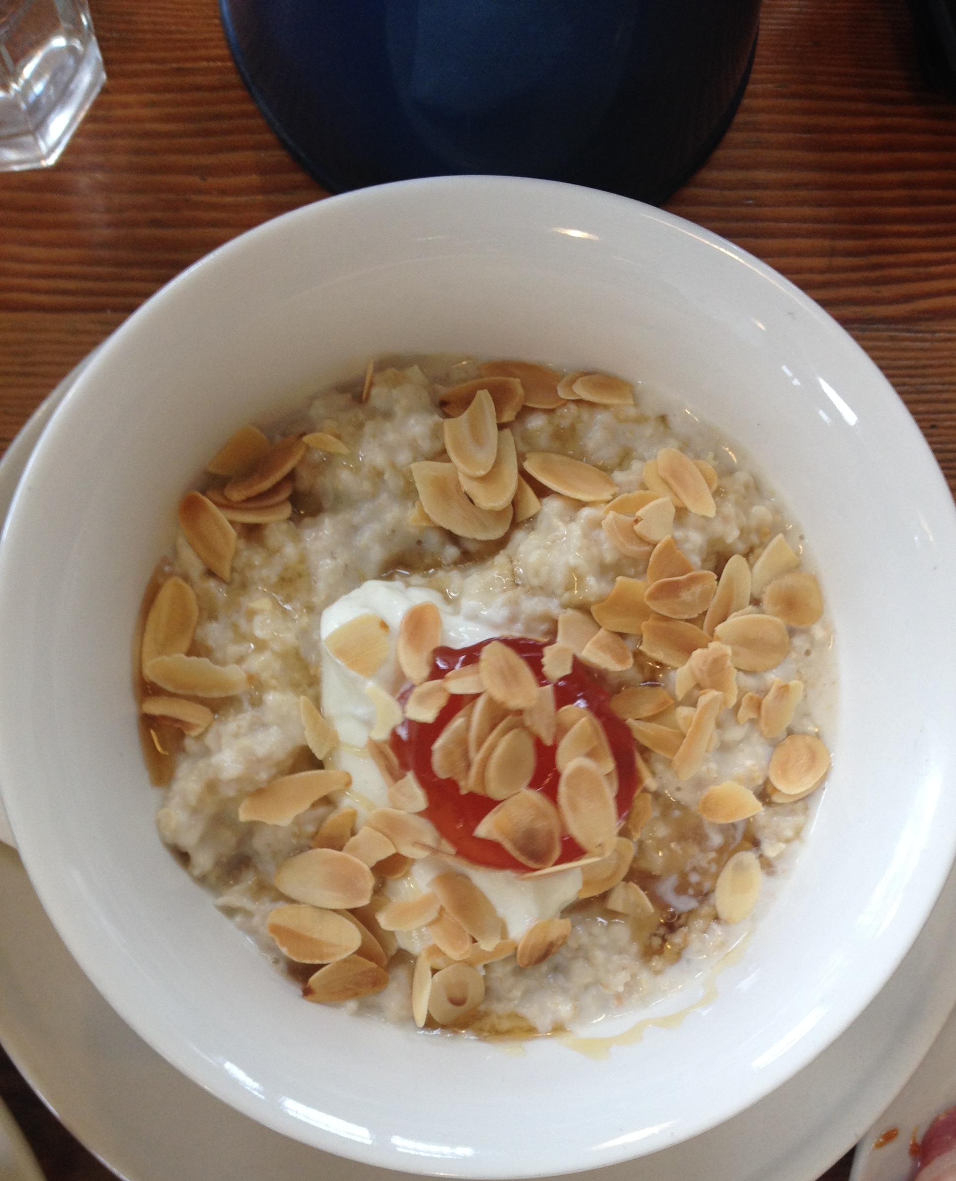 porridge with poached seasonal fruit, almonds and yoghurt.