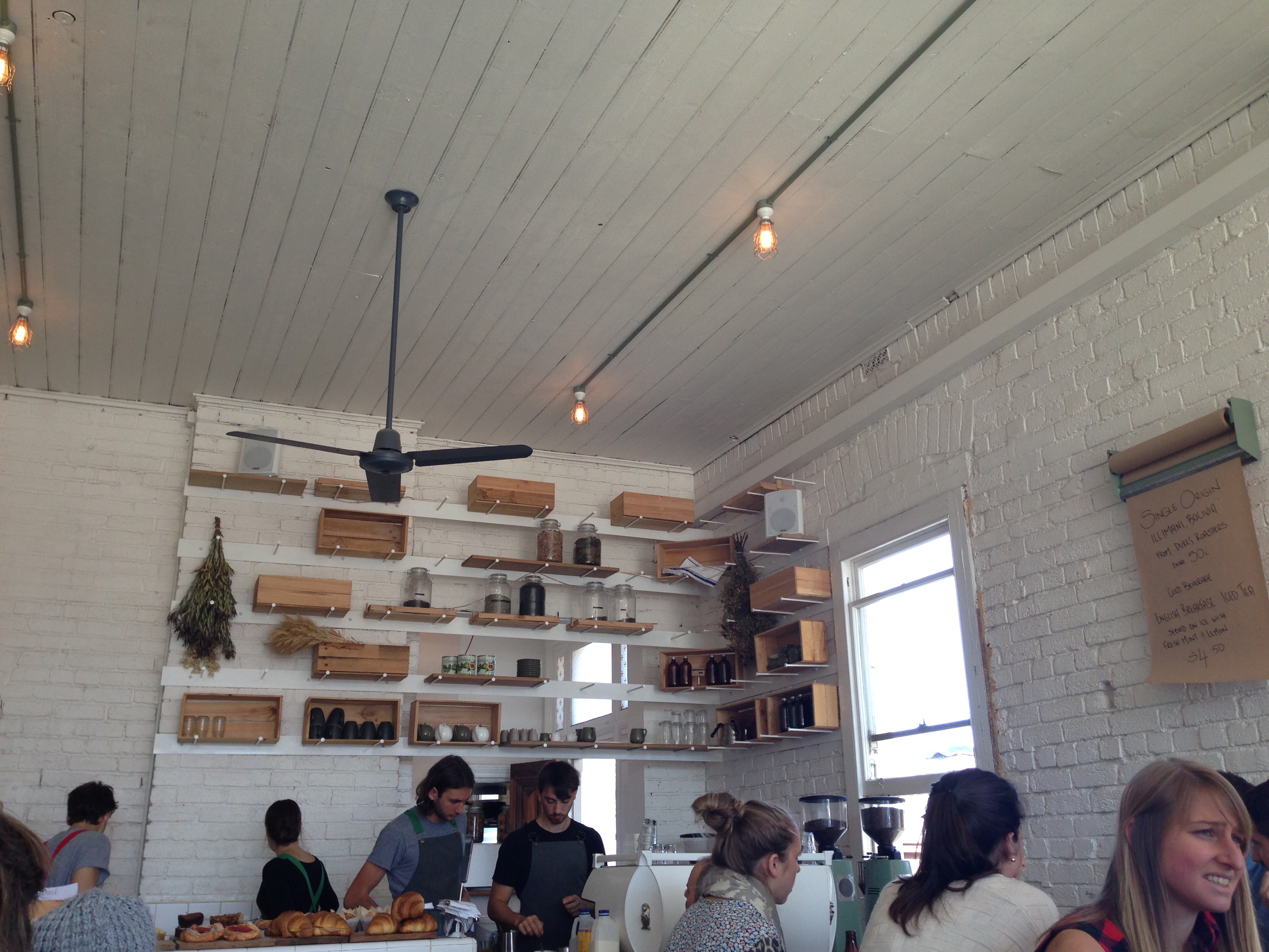 the inside decor is delightful with plenty of crate-shelves, plants and wooden chairs aiding to create a really funky interior. there is a great big bench table and some window seats and a window bar. teemed with the uber-tall timber ceilings and light-airy feeling… the cafe has a great atmosphere.