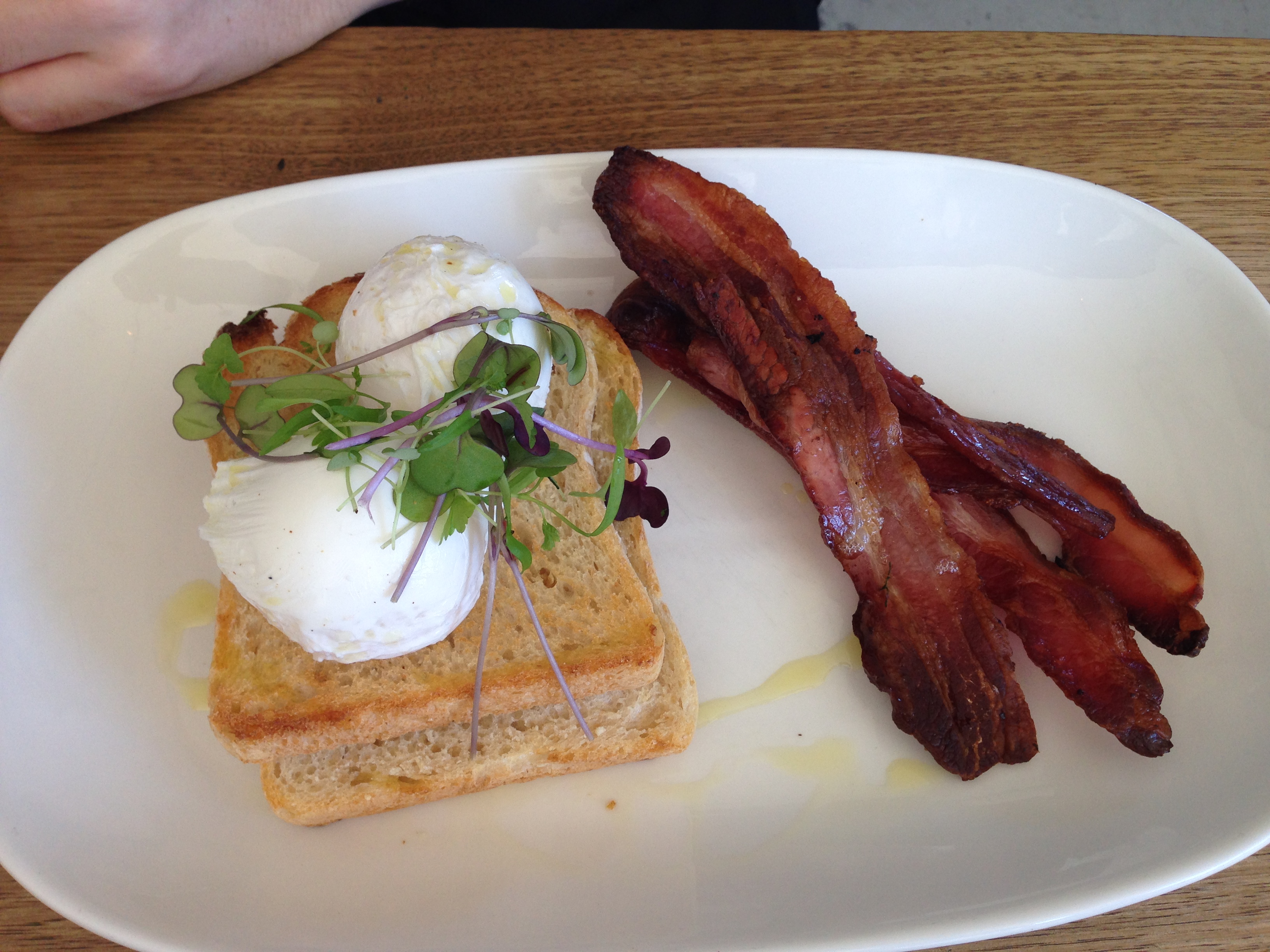 poached eggs and bacon again, poached eggs were well cooked with runny yokes. but being somewhat of an expert in bacon + eggs, my husband was disappointed with the bacon. only 3 small rashers, overly fatty and crispy american style.