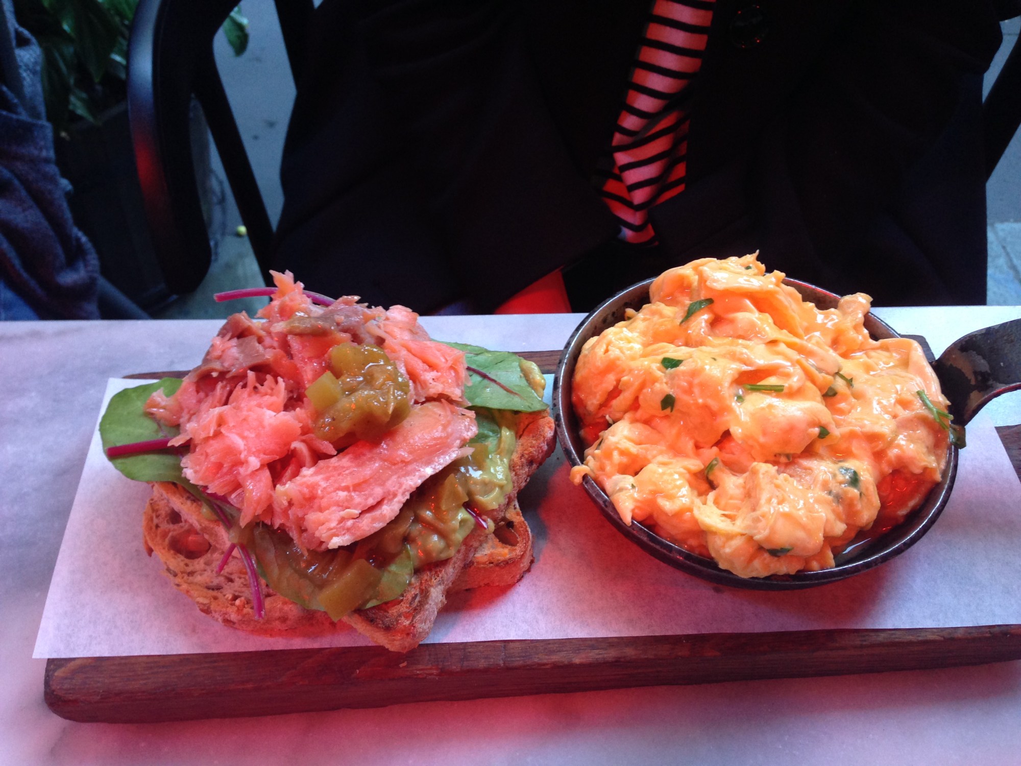 scrambled eggs un with hot smoked salmon, pickled green tomato + avocado puree.