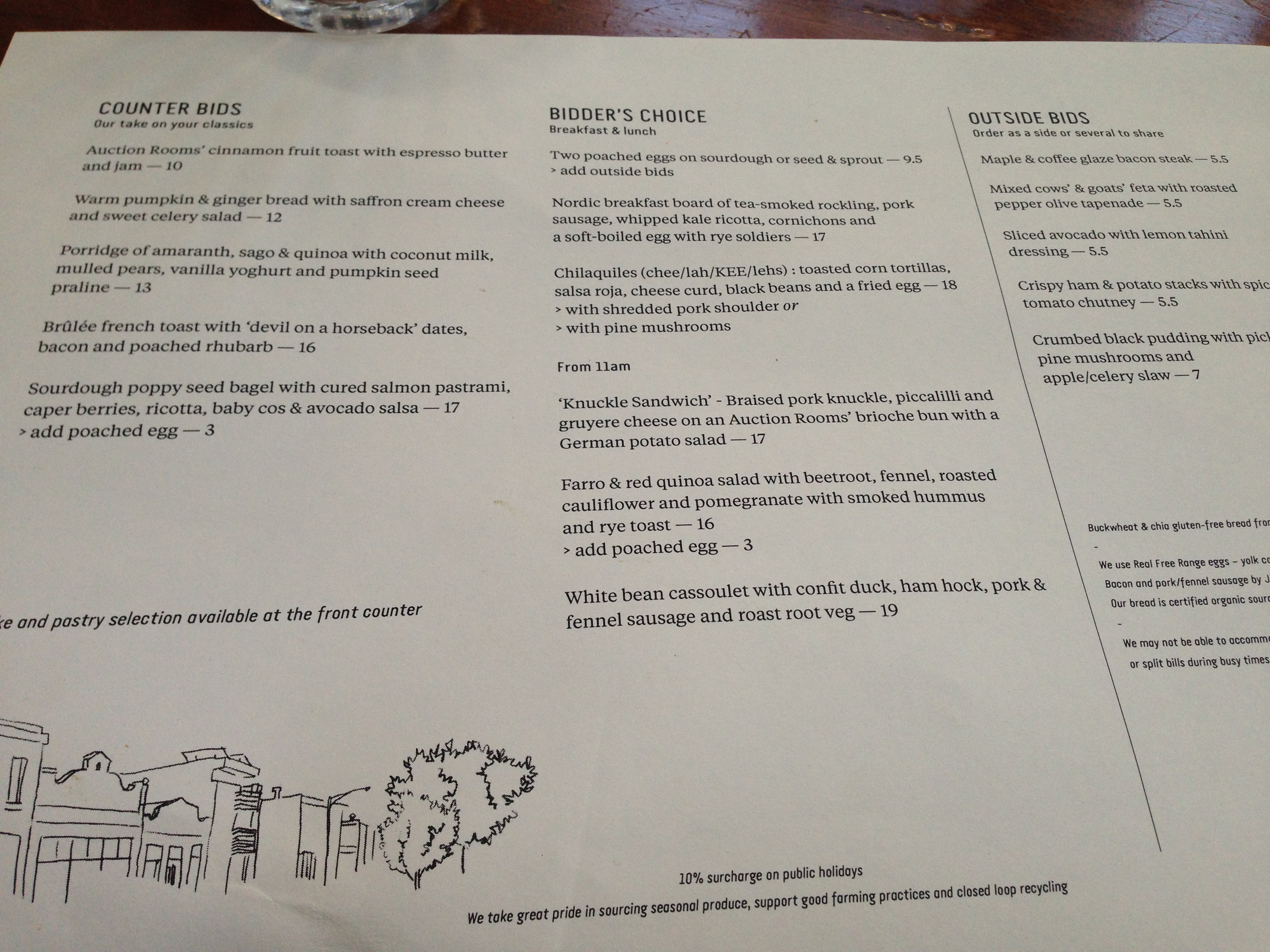 this very hipster cafe is located on errol street, north melbourne. just one block up and over from the queen vic markets (for those who like a landmark and don’t mind a short walk), it was once home to the old wb ellis auction house and i appreciated how they have carried over the theme into the menu language.