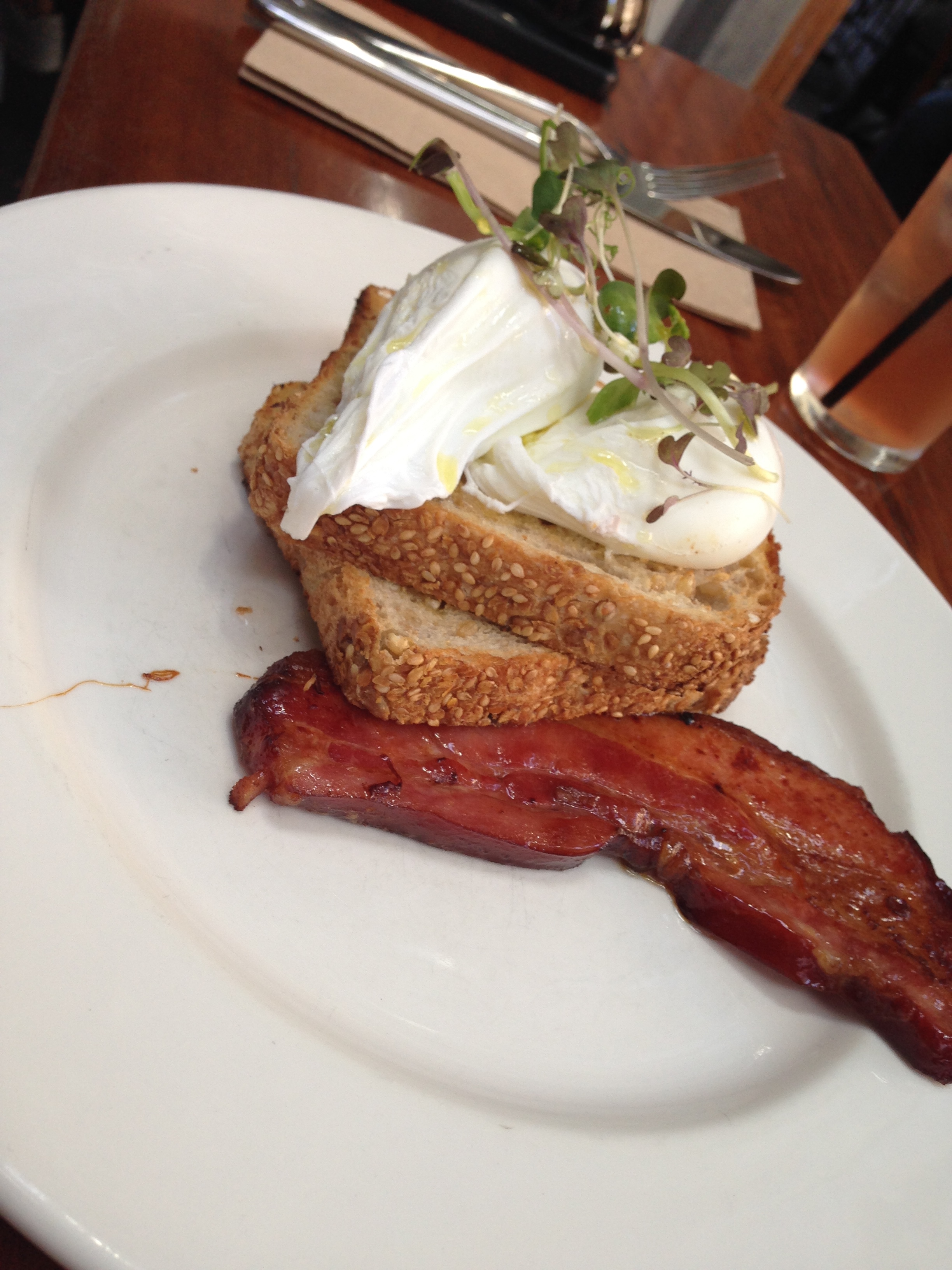 eggs were delicious – with yellow, runny yolks. the thick bacon “steak” reminded me of a christmas ham. it had a lovely flavour, but was a small and fatty portion for $5.50.