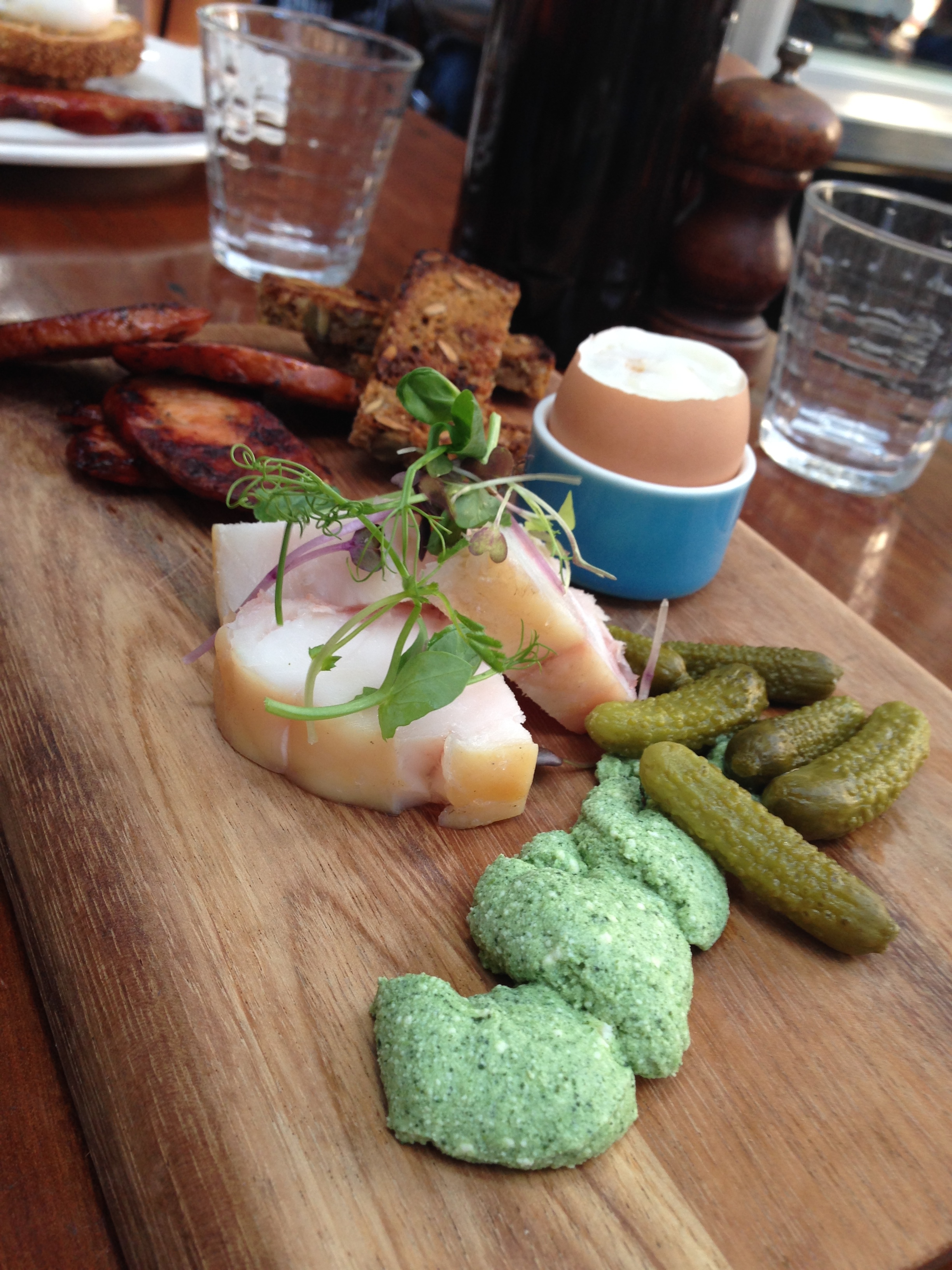 nordic breakfast board of tea-smoked rockling, pork sausage, whipped kale ricotta, cornichons and a soft-boiled egg with rye soldiers.