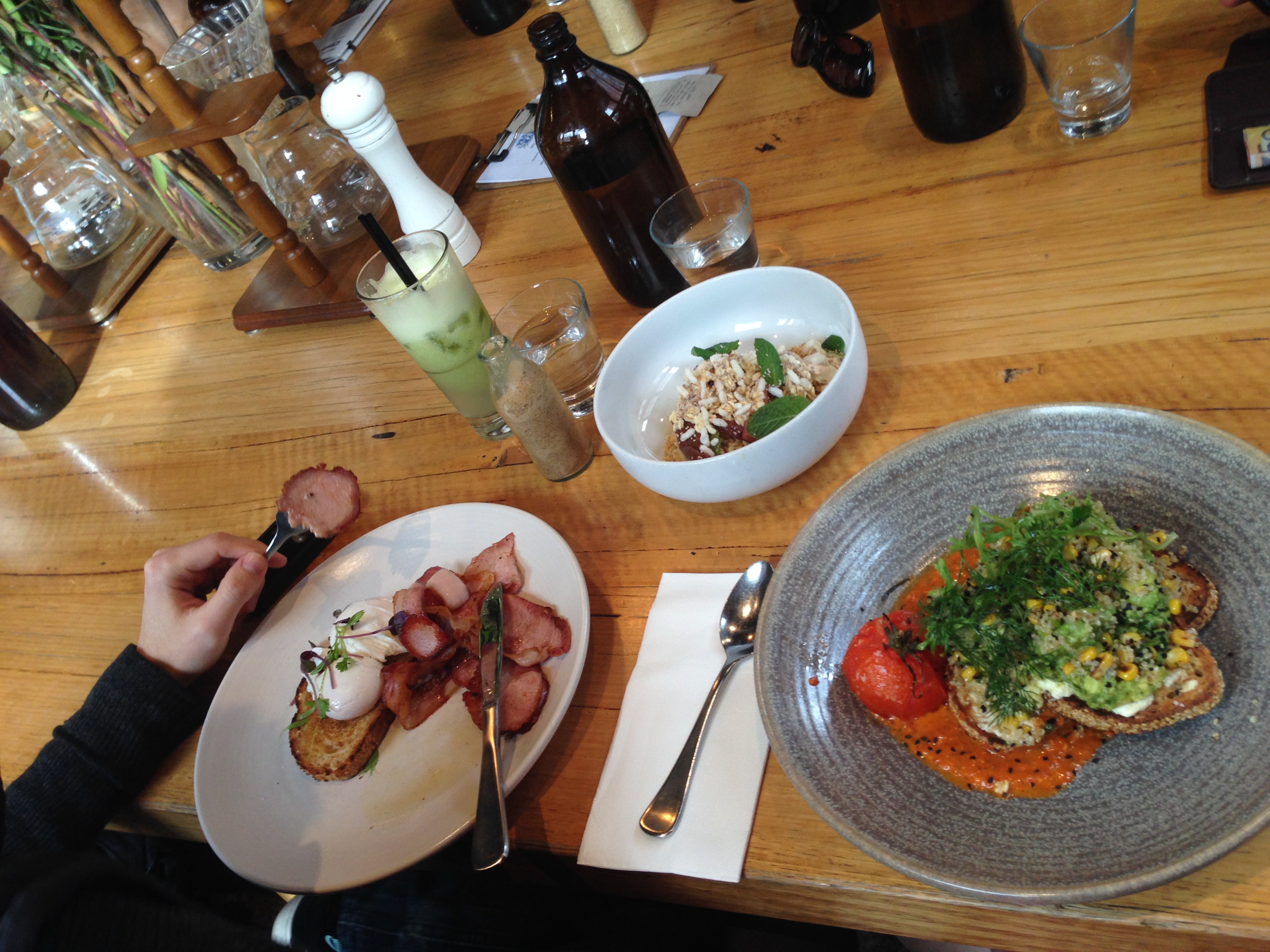 we did have a small incident though, which left me a little disappointed. i originally wanted to try the haloumi breakfast but unfortunately was told they were sold out for the day. understandable given it was just past noon, and i was happy enough to move on to my 2nd savoury option (the avocado). our next preference was to share the ricotta hotcakes as we had major food envy watching four others around our big table devour this delicious-looking dish (served with gooey mandarin caramel, honeycomb + ice cream). again told they were sold out for the day, and we settled for the bircher.