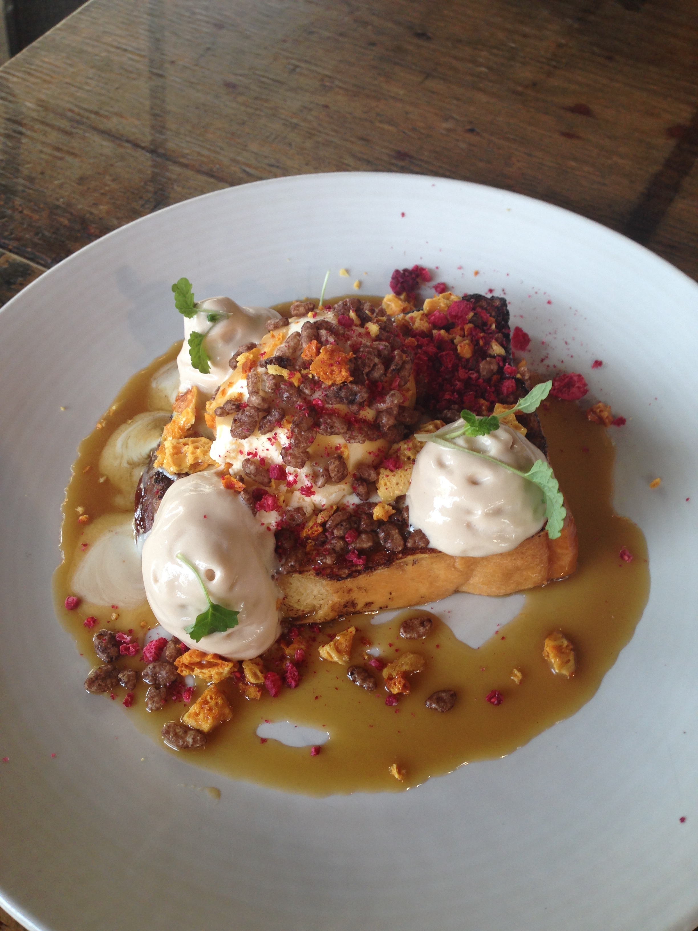 coco pop + salted caramel french toast with coco pop cream pat, vanilla ice-cream, salted caramel, honeycomb + raspberry crunch.