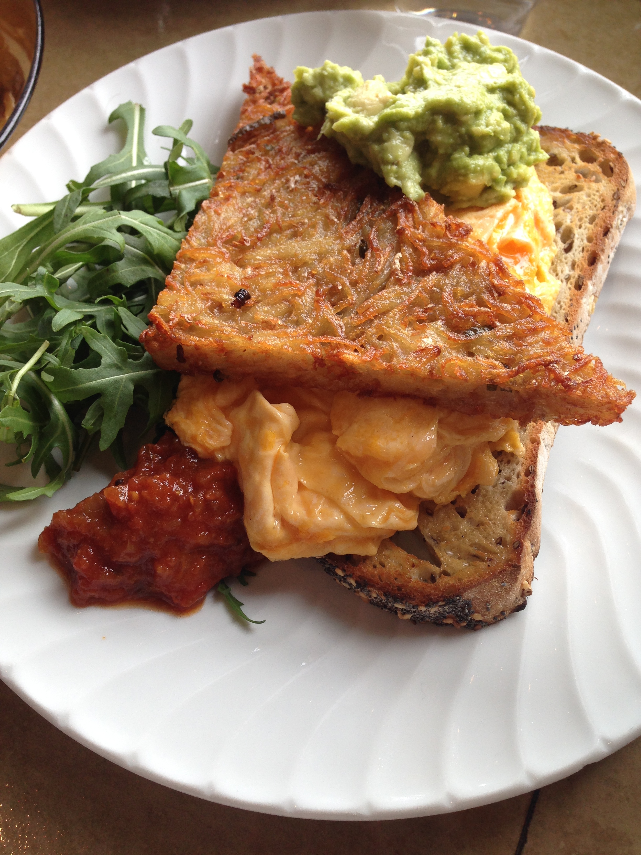 the truman brekkie scrambled eggs, hash, avocado + relish on sour dough multigrain