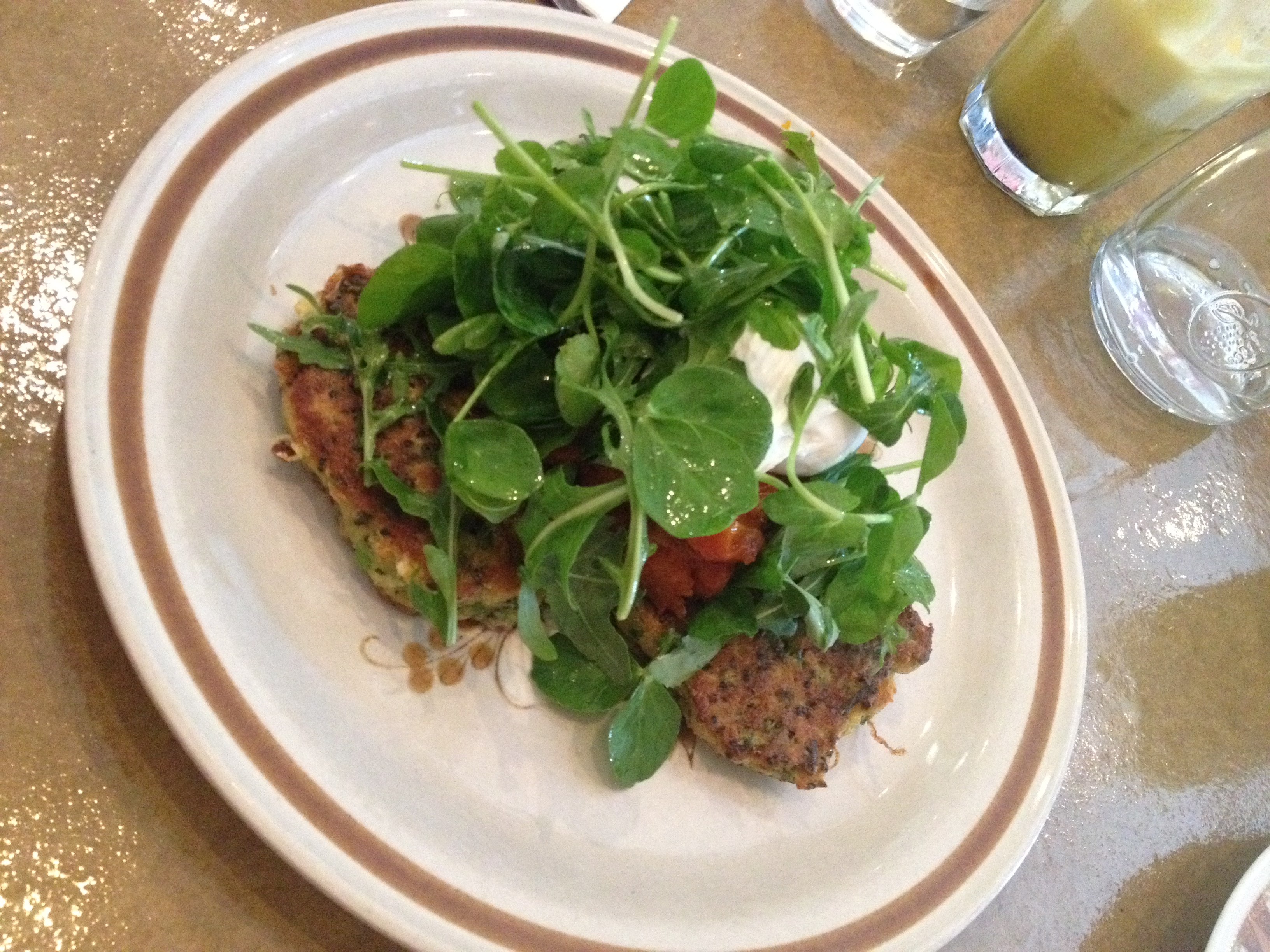 brekky special black quinoa, pea + basil fritters with poached egg + pumpkin relish
