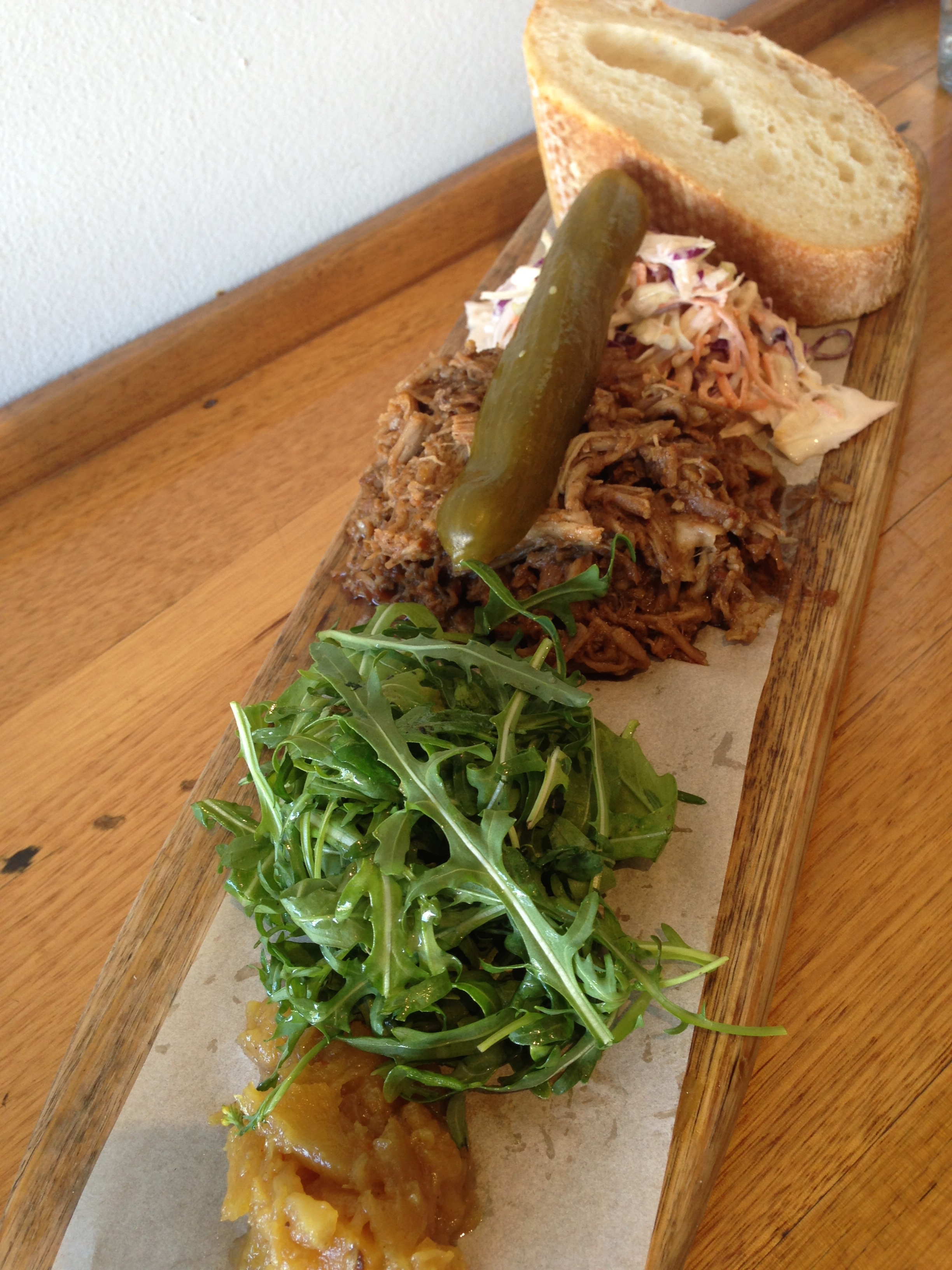 having recently returned from the usa, i am still “slightly” addicted to burgers + barbeque / pulled anything … thankfully, melbourne’s food trends are appeasing these cravings at the moment! this pulled pork was mouth-wateringly delicious! as was the slaw, which had an absolutely sumptuous dressing. and whoever nana kath is… i want that chutney recipe from her!… a perfect condiment to put with all of these components. my only criticism is that i would’ve loved a couple of thinner pieces of bread to smack all of these amazing ingredients in-between, rather than one big chunky piece which meant i found i mostly ate this with a fork… but make no mistake this dish was still delish!