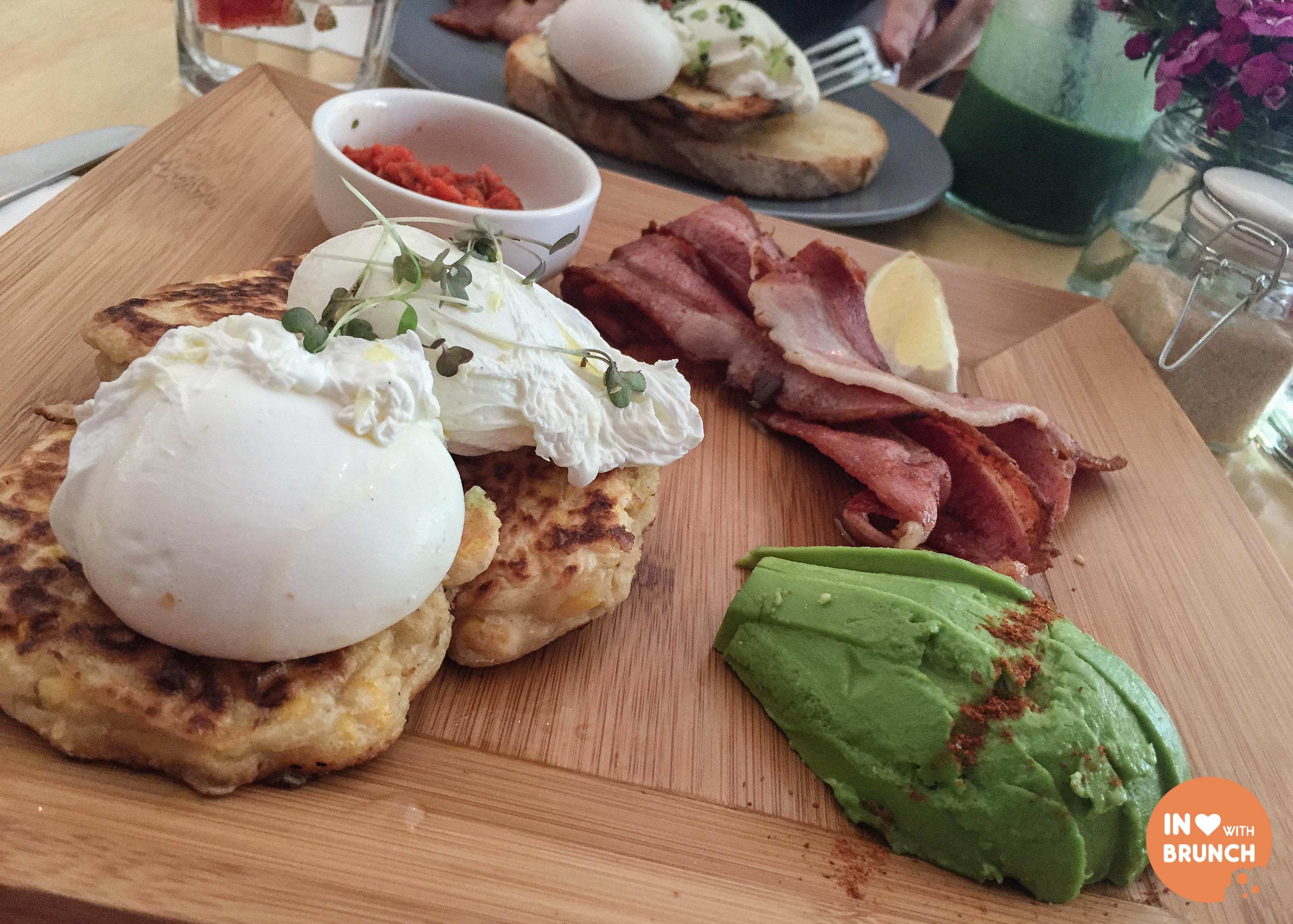 spiced sweetcorn fritters with red pepper salsa, bacon, avocado + poached eggs. egg yolks were runny and the salsa had a good kick to it. the bacon was excellent. avocado was creamy and fresh. i was disappointed with the corn fritters, they were undercooked so the texture was powdery + a bit doughy.