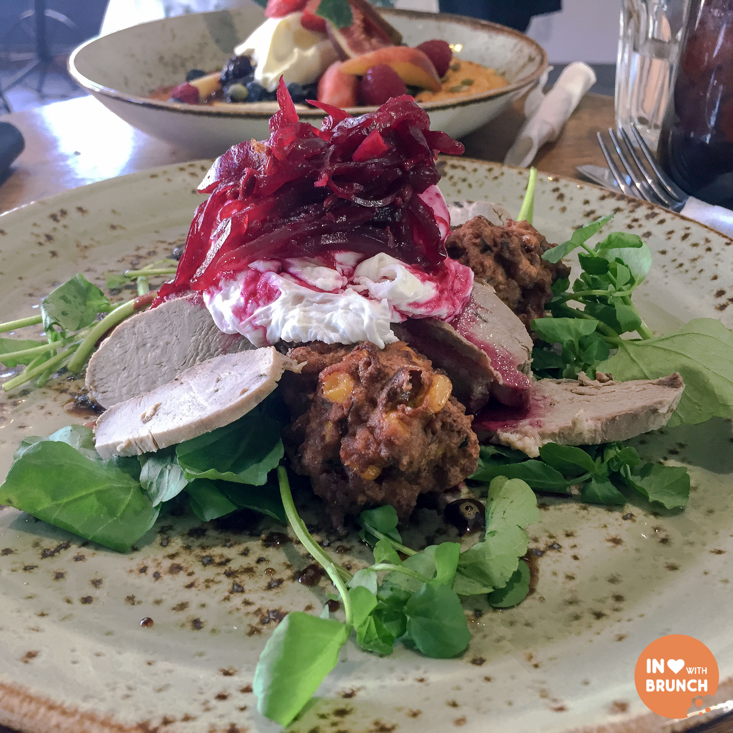confit duck on zucchini + corn fritters with fresh watercress, poached egg + beetroot relish and drizzled pomegranate molasses. i’m always a bit anxious when ordering fritters (nothing worse than powdery under-cooked fritters), but these were amazing! crispy, crunchy + plenty of corn! yum! the beetroot relish + pomegranate molasses was sweet + perfectly complimented the duck. double yum!