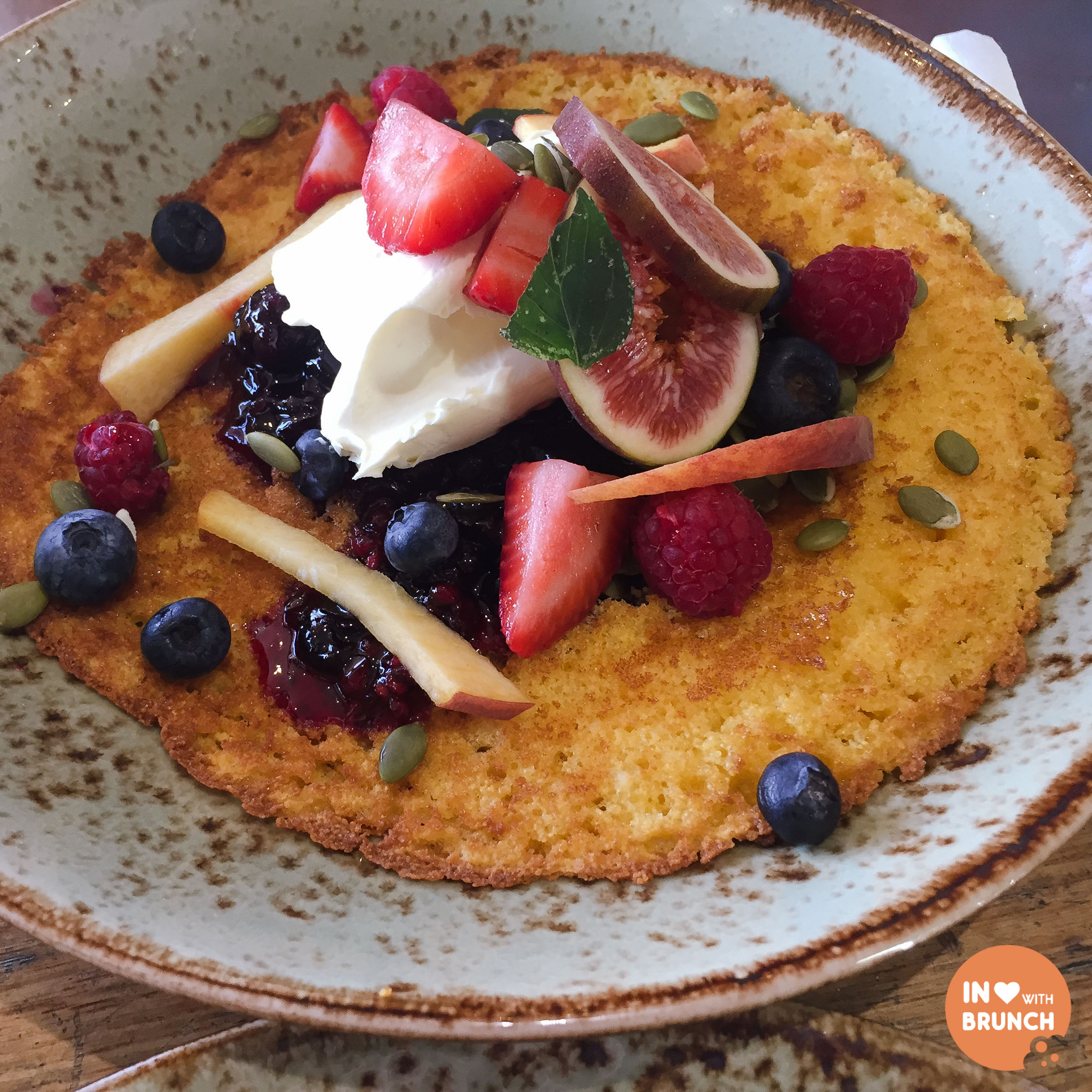polenta hotcake with fresh seasonal fruits + berries, whipped mascarpone, and a house made mixed berry coulis. first off, i loved the consistency of the polenta – italian origins, cornmeal boiled like porridge + then baked, fried or grilled – hotcake! it was light + less sugary than a standard hotcake. secondly, the fresh fruit on top – figs, finely sliced fresh peach – were juicy + tasty. the berry coulis contained blueberries, strawberries, raspberries, blackberries (a possibly a few other hidden varieties) – delicious! and all wonderfully pulled together by a creamy mascarpone… this dish is drool worthy + a creative variation on the other hotcakes found on numerous melbourne cafes.