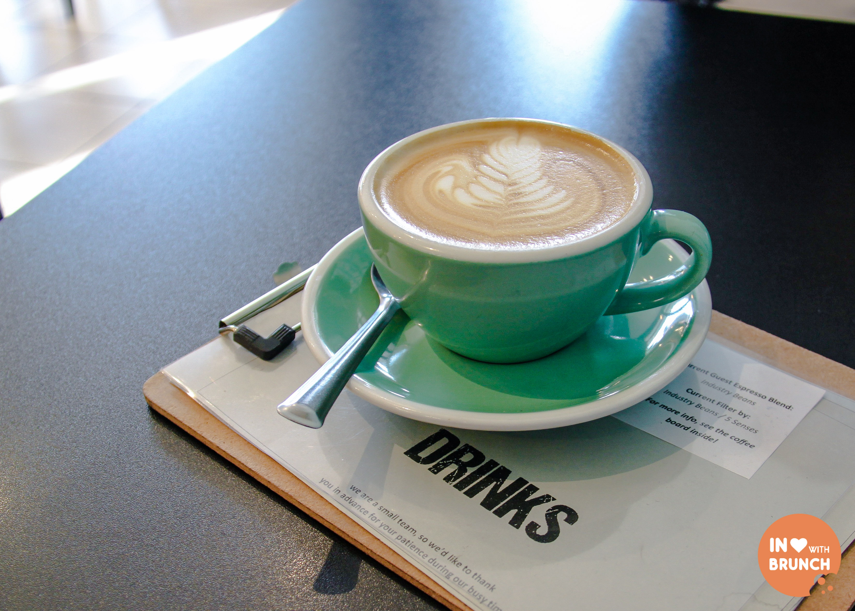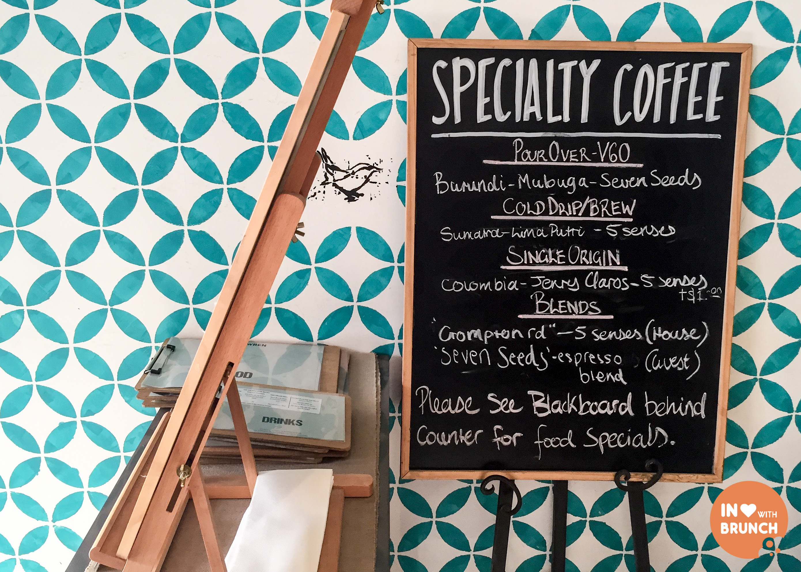 the cafe has a laid-back interior with the design focusing predominantly on recycled material – most obvious on the main counter which is made entirely from pallets. there is a re-purposed easel housing the welcome board, a vibrant teal paint pattern along one wall which makes for an eye-catching feature, beautiful baked goods on offer at the front bench + plenty of other small features to catch your eye and make you feel like there is a lot of love + pride invested in this cafe.