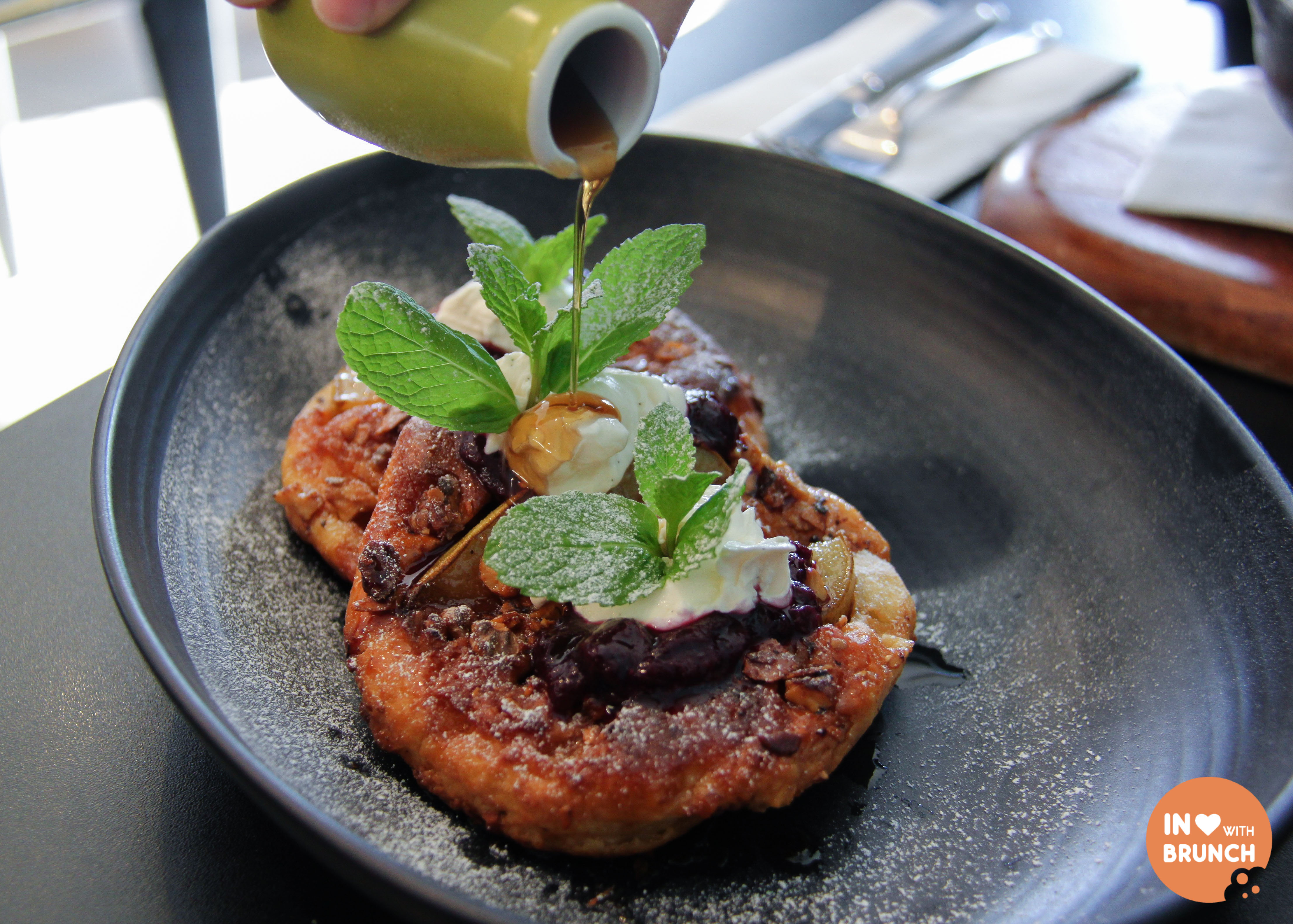 caramelised pear, almond + walnut pancakes with vanilla mauri mascarpone, rhubarb and blueberry compote, fresh mint + pure canadian maple syrup.