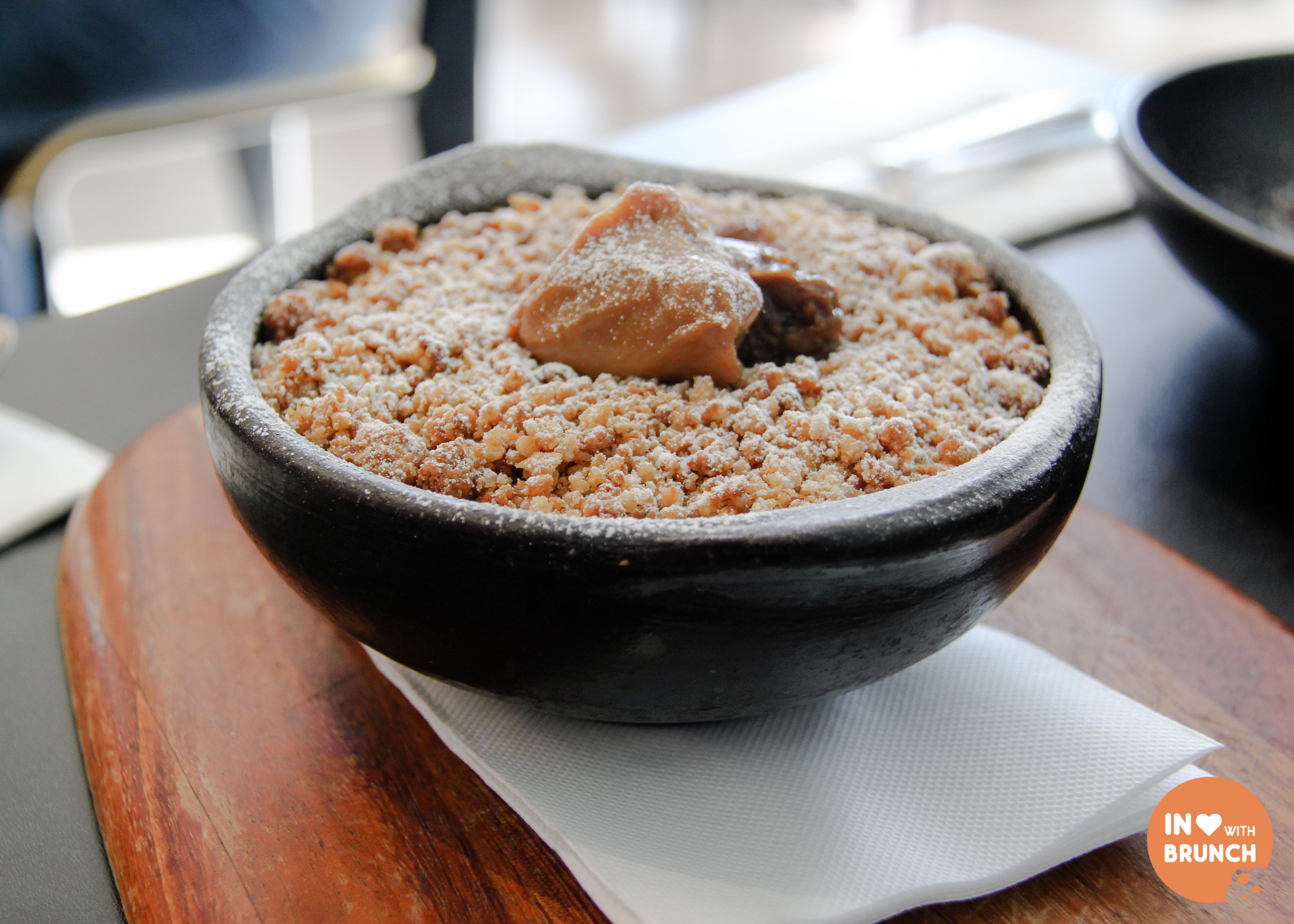 banoffee porridge with caramelised banana, stewed dates, dulce de leche + toasted coconut crumble. this was the dish i have been dying to try + the crisp cool autumn morning was perfect for a comforting bowl of steaming oats. the thick coating of toasted coconut crumble brought back fond memories of my experience with posh porridge in christchurch nz, and paired perfectly with the soft creamy oats underneath. the spoonful of stewed dates + dulce de leche (click on the link if you’re not sure what dulche de leche is – it will have you drooling for your own bowl of this gooey goodness!). it didn’t let me down! this banoffee porridge is an absolute winner – with a monster-size serving that i tried my best (but failed) to make a decent dent in.