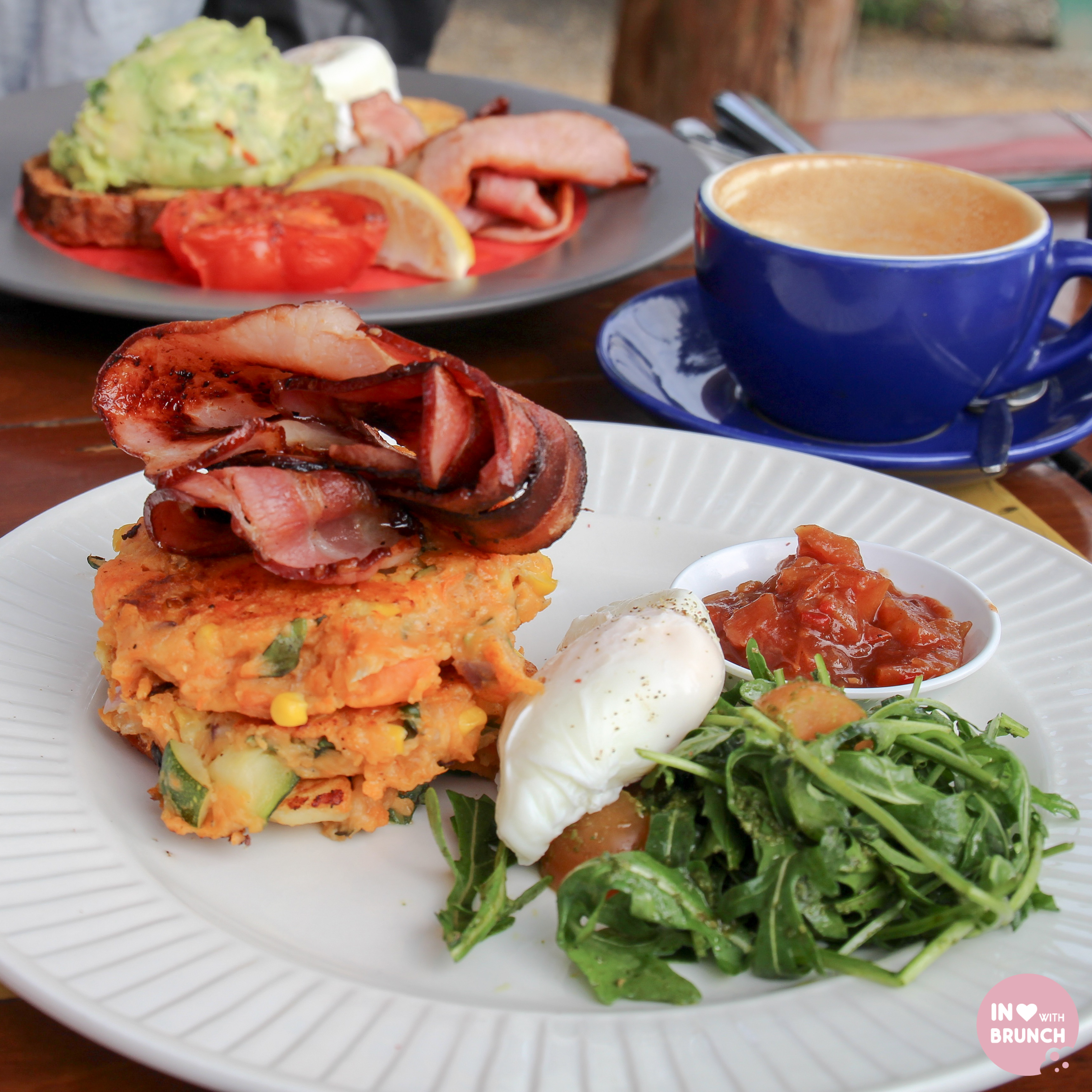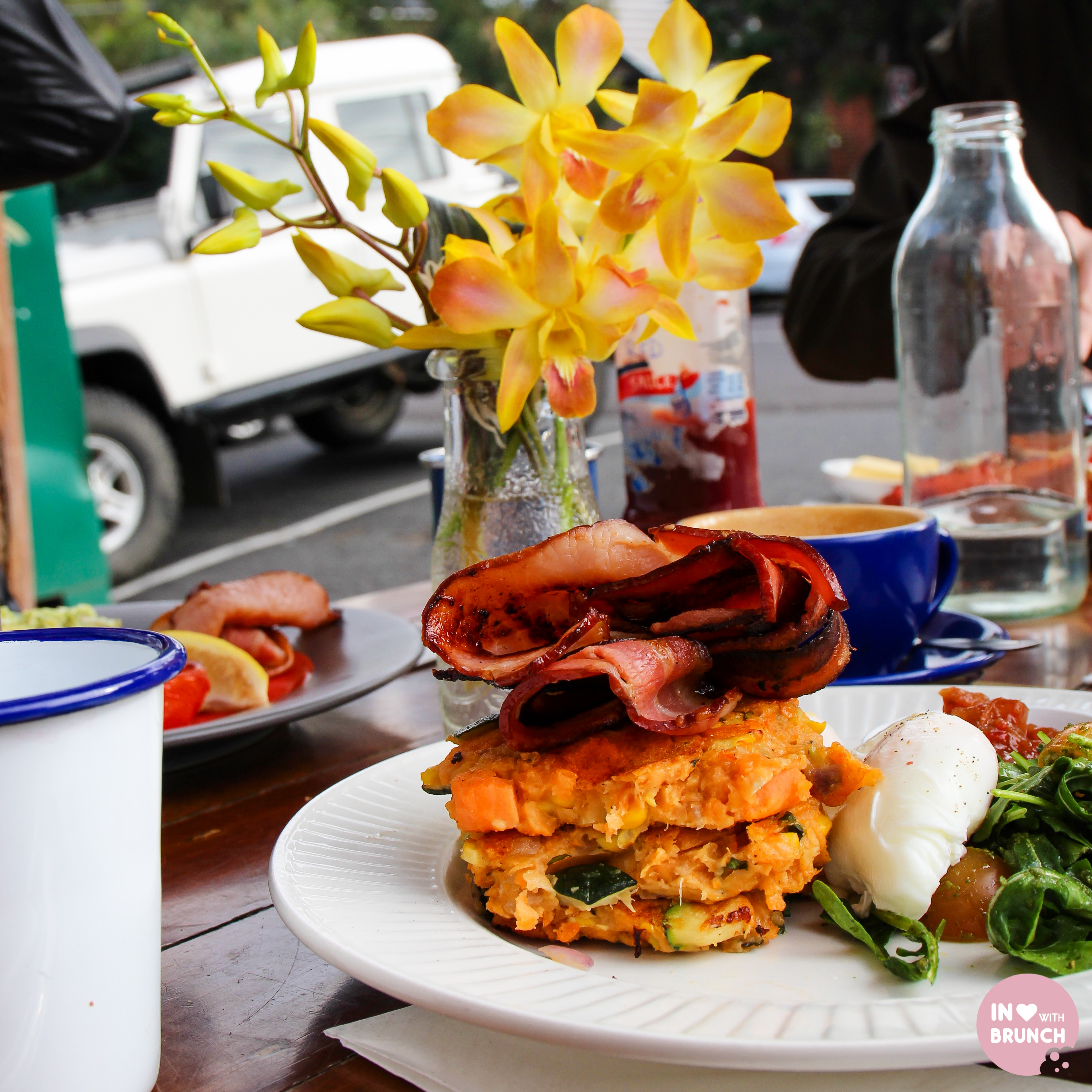 this morning i opted for the weekend special and the fritters were absolutely delicious! they were packed full of chunks of zucchini + corn with a crunchy outer crust but still soft inside, and the bacon was crispy + generous. unfortunately the poached egg was well-over but when paired with the other ingredients + that spicy smoky salsa/chutney – overall it was still a pleasant dish. (the boys had all ordered plain ole’ bacon + eggs and in fact the theme of the morning was all of the poachies around the table had been taken that little bit too far, which was a bit disappointing)