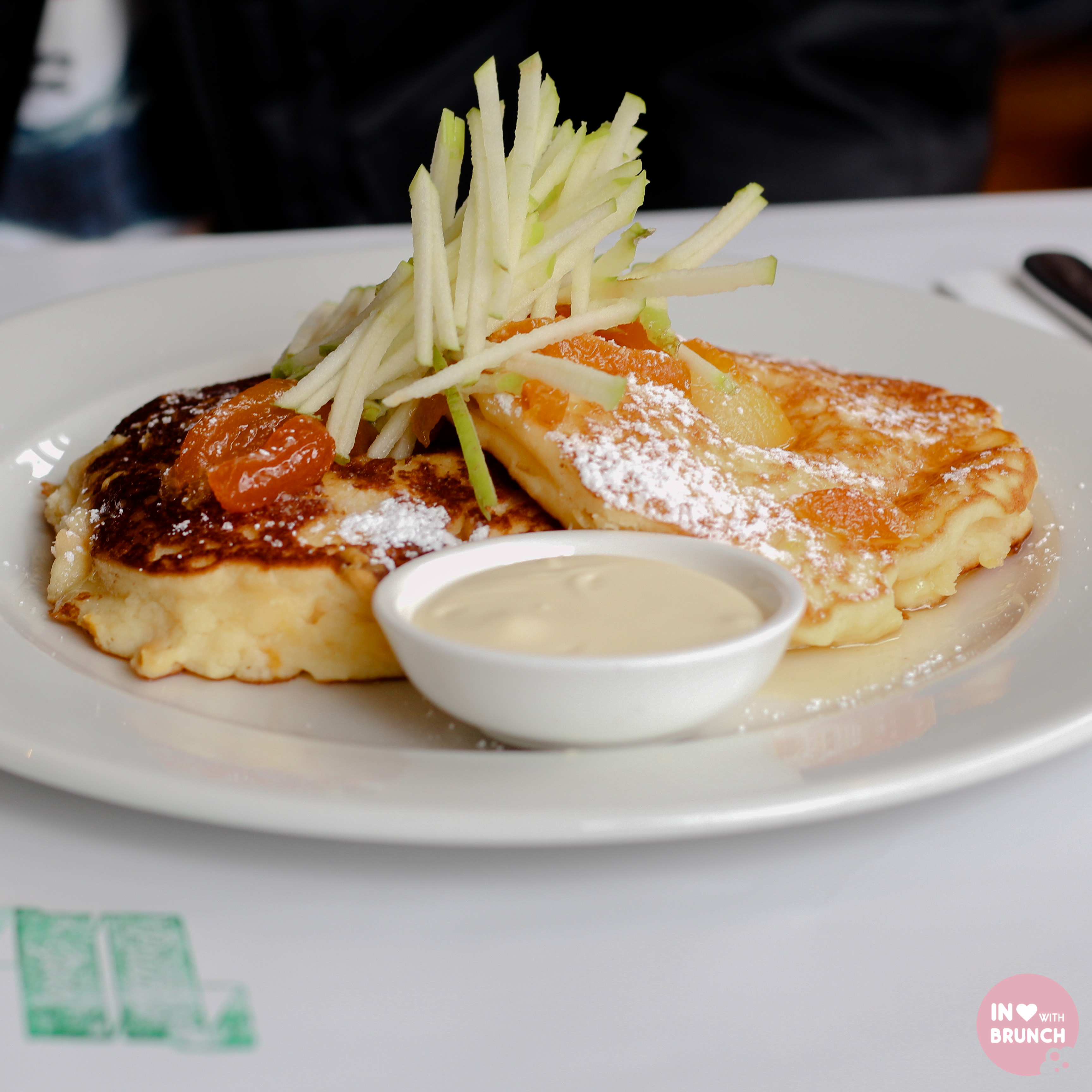 apricot pancakes served with vanilla mascarpone fresh apple + candied almonds