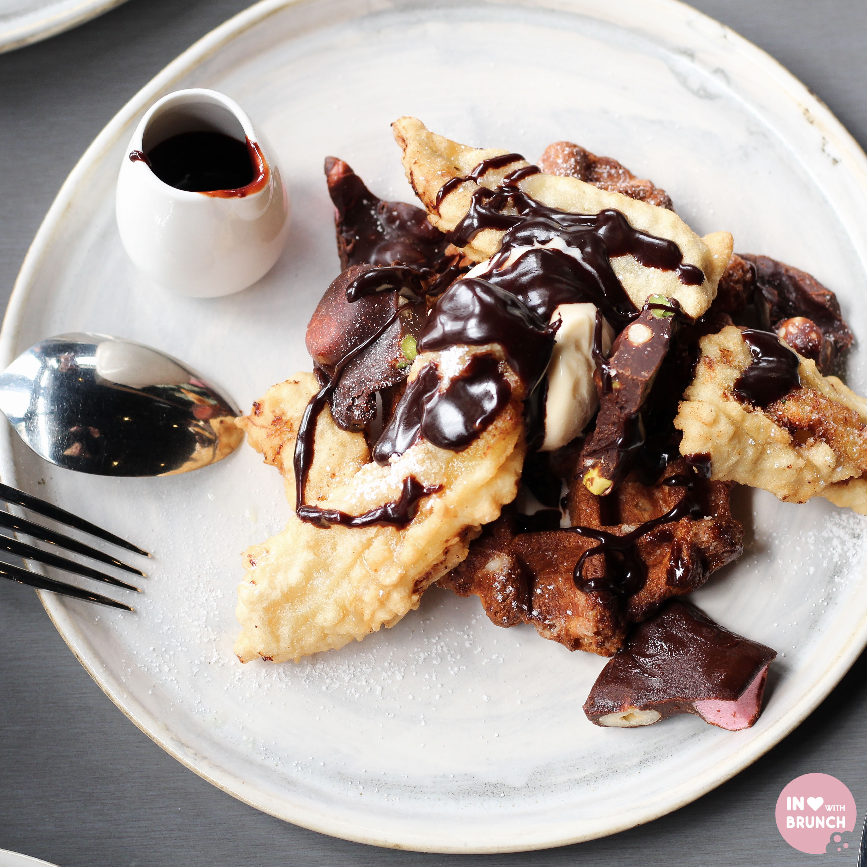 chocolatey rocky road waffles: waffle stack, banana fritters, rocky road crumble, vanilla ice cream + hot chocolate sauce