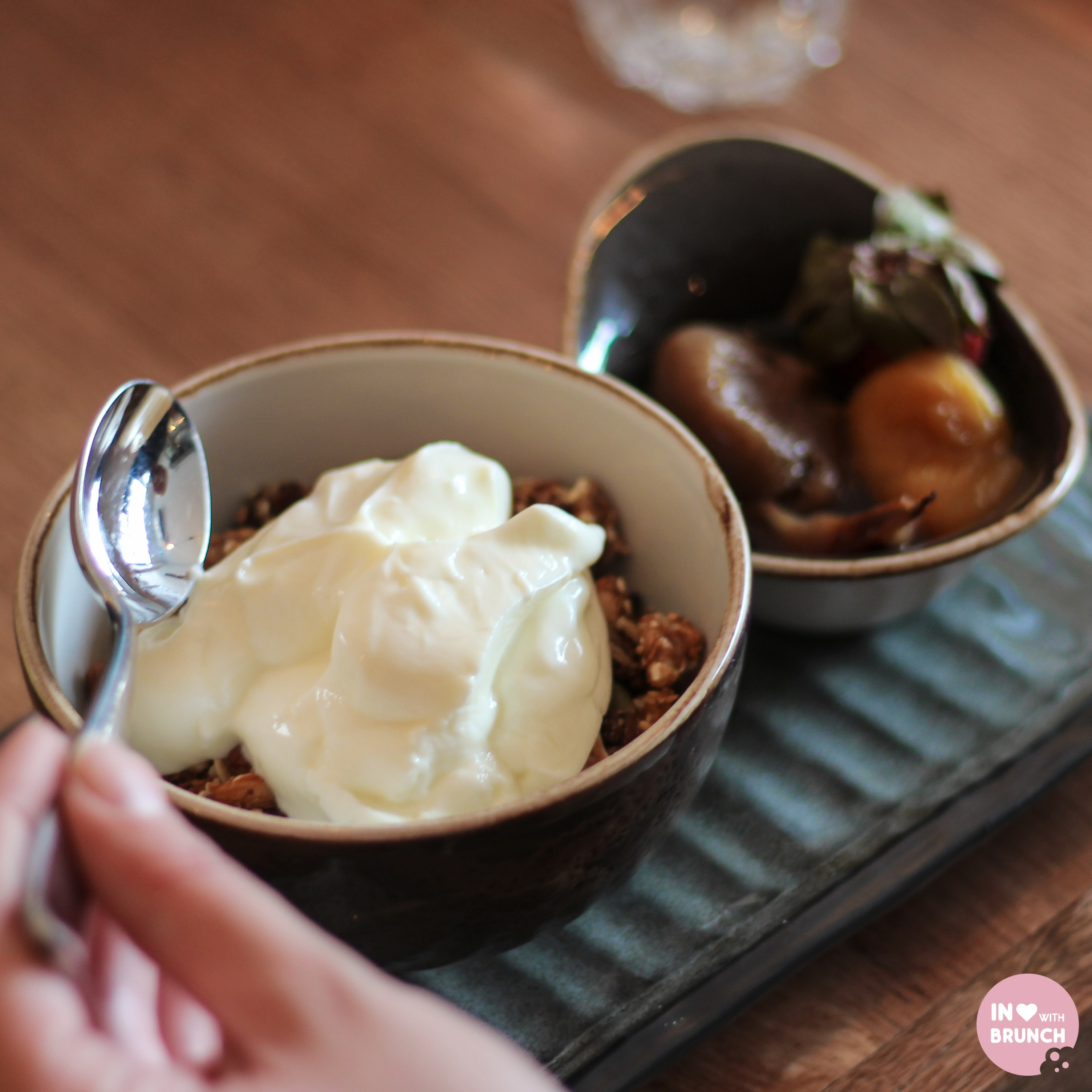 toasted muesli (vegan), made in-house with nuts, seeds, coconut & dried fruit, toasted in yellowbox honey + served with greek yogurt + poached fruits of the day