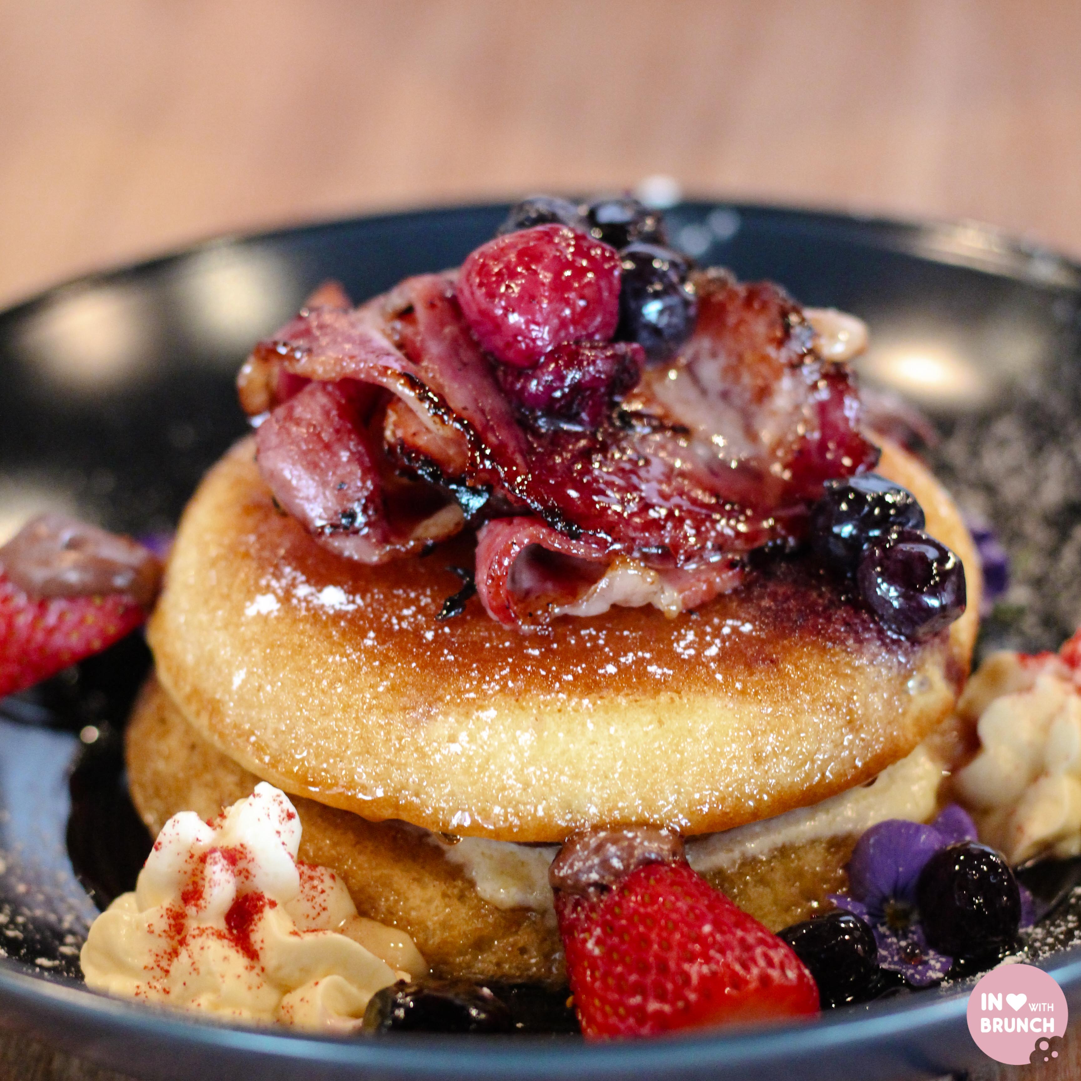 just as they should be, the fluffy pancakes were the highlight of this dish! now, i’ll admit that i have this thing with mixing savoury + sweet and have never been a fan of things like apricot chicken, or bacon with maple syrup for example. my husband, however, has joined what is probably the rest of the entire world on the sweet-savoury cheer squad… which is good when a pancake dish comes with bacon because he’ll happily have a try! the berries + cream were a good addition to this dish, and overall it all worked well together.