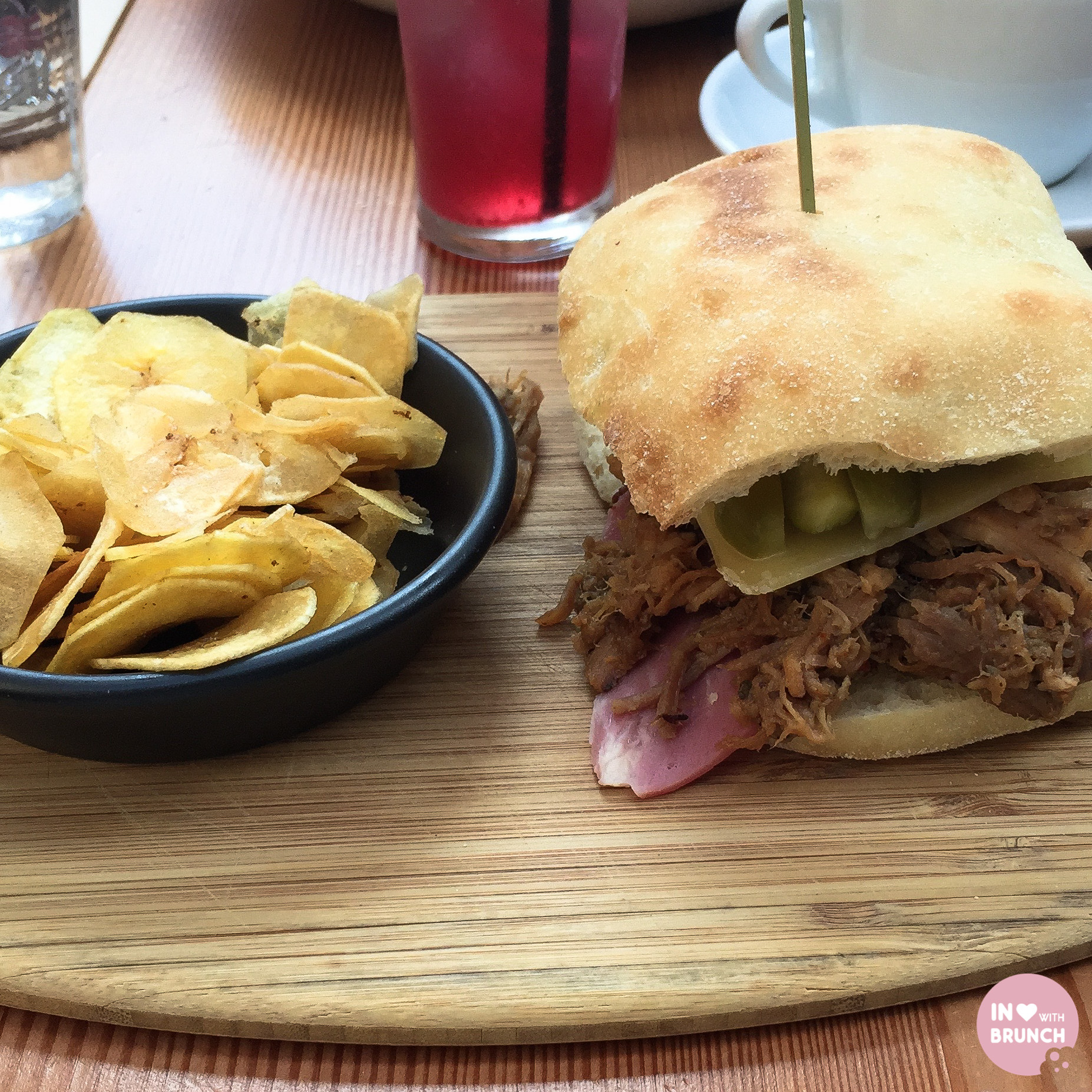‘cubano’: cuban pulled pork sandwich with leg ham, swiss cheese, dill pickle + beer mustard with plantain crisps