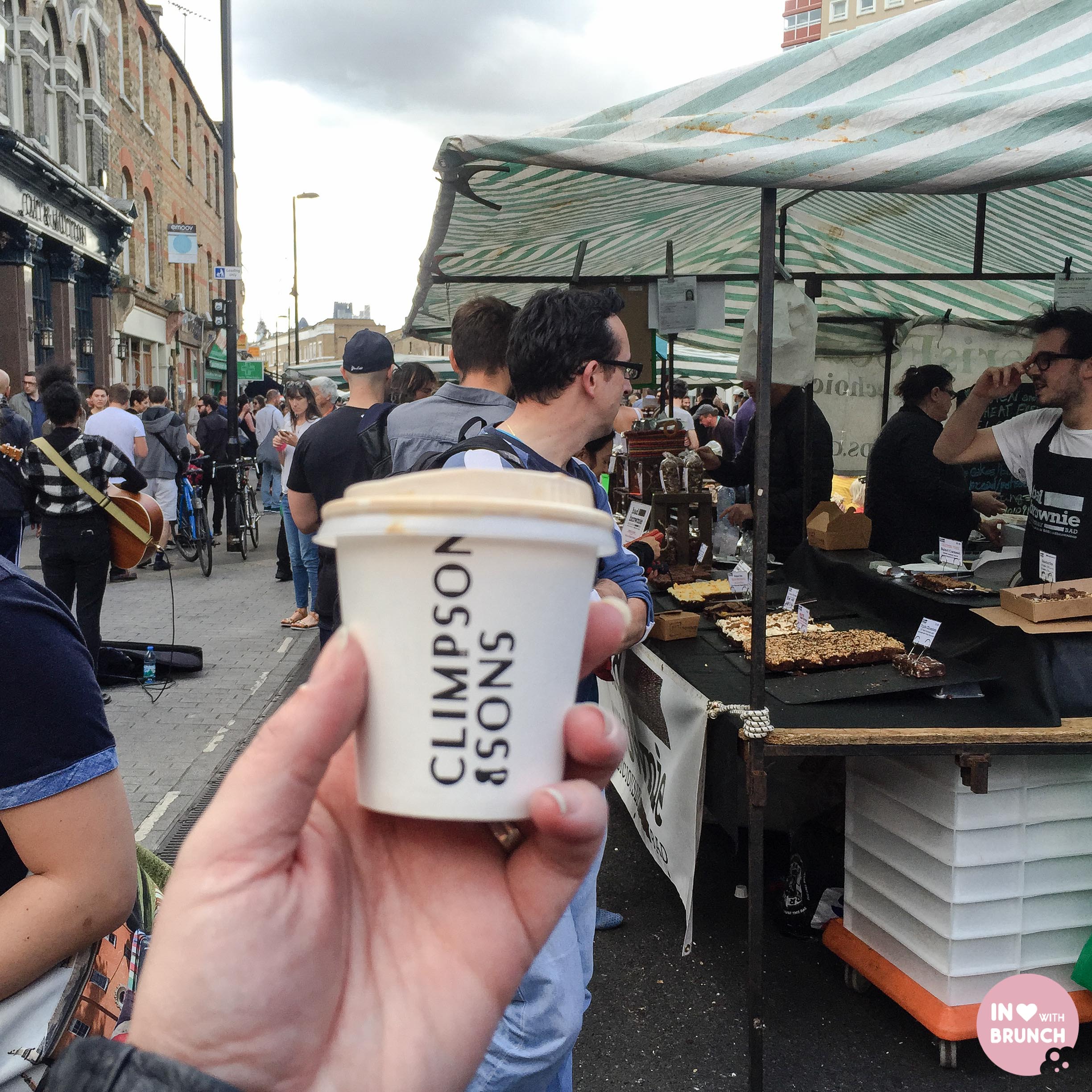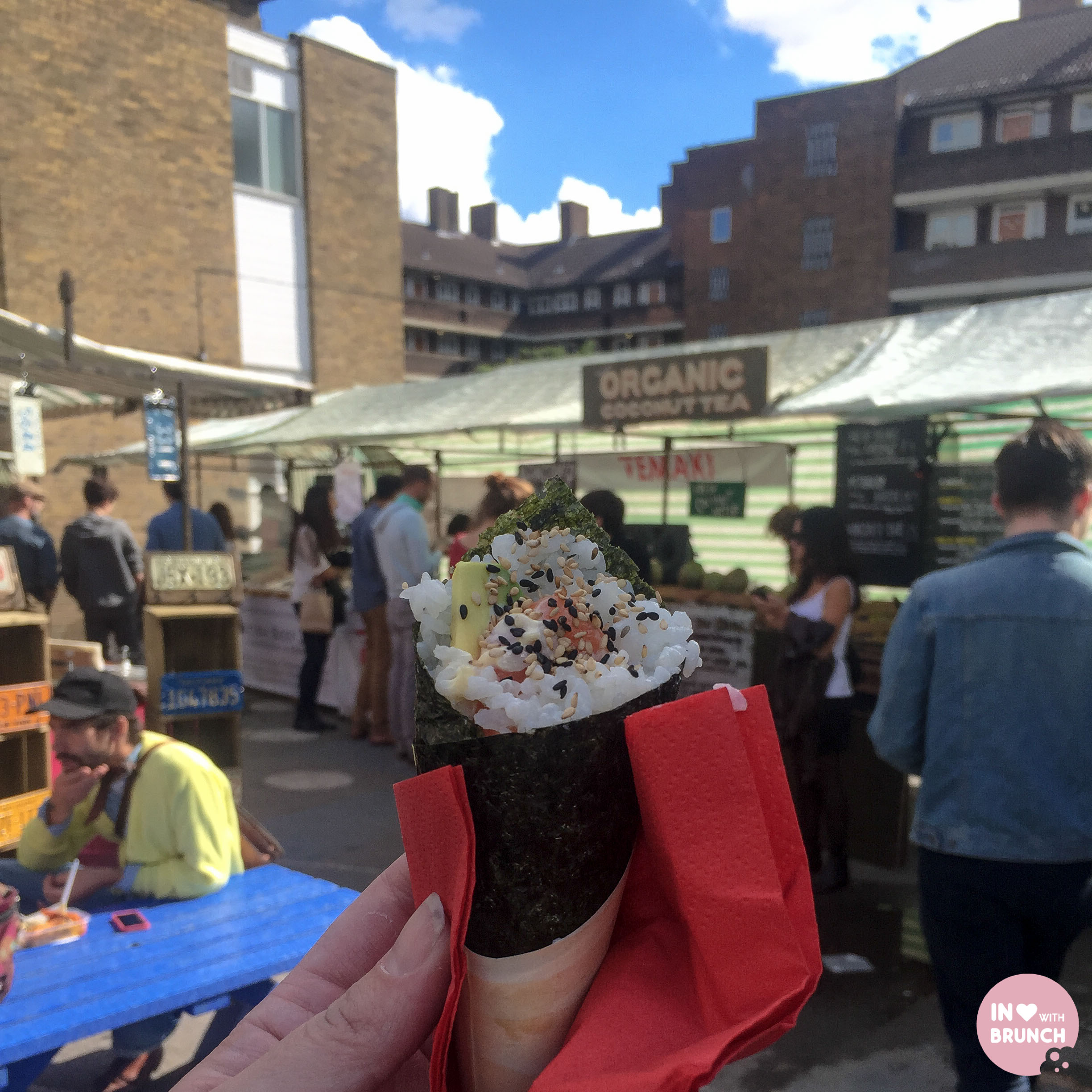 on a saturday morning in hackney, broadway markets is the place to be! the vibe is amazing – brimming with food, drink and craft vendors – you will find it difficult to choose what to eat! i went for a climpson + sons flat white, which after 2 weeks of italian coffee really hit the spot; and a yummy sushi cone.
