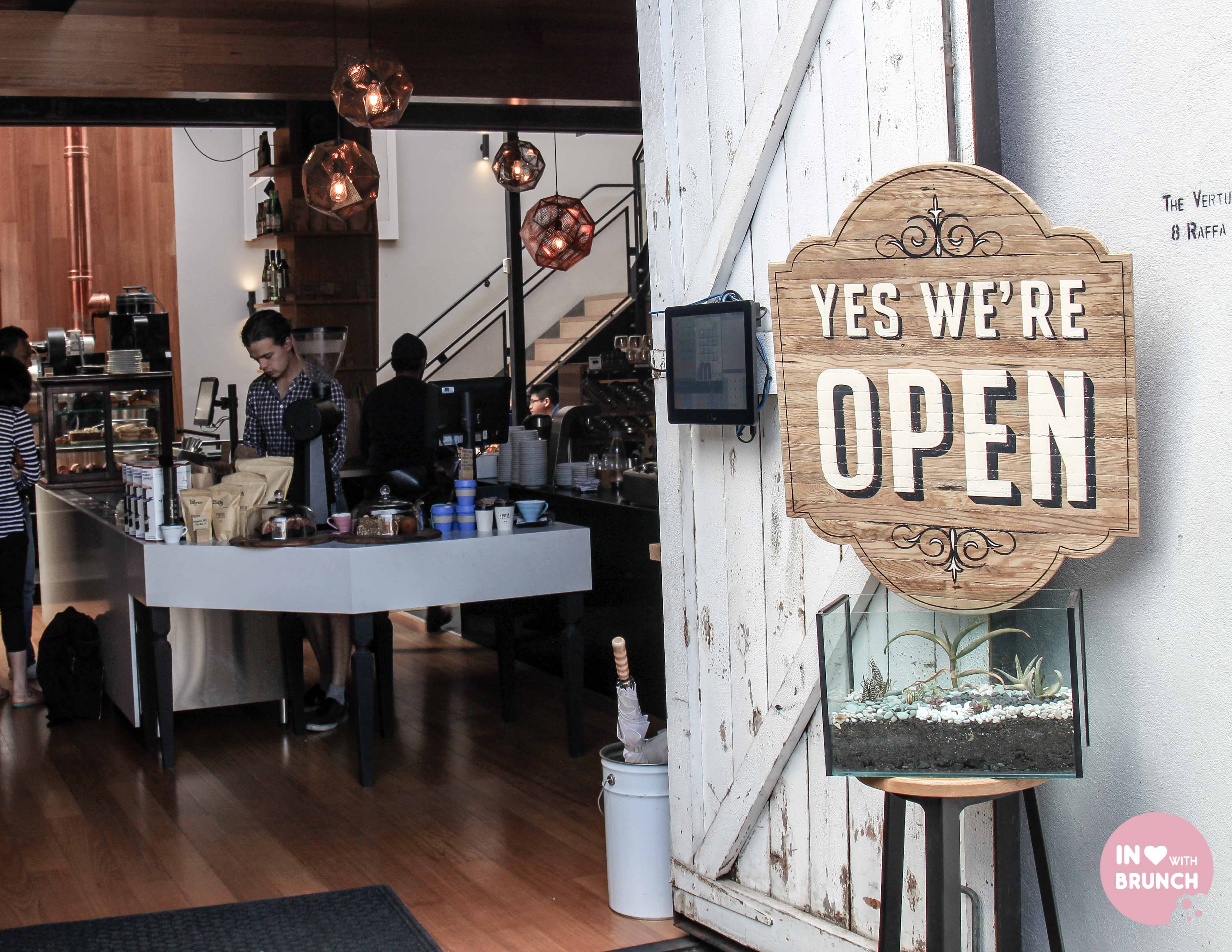 opened in february of this year, the vertue of the coffee drink are a micro roaster, retail space, cafe + kitchen all in one gorgeous location. the ground floor is set in a towering greenhouse type space with an industrial feel, transparent glass ceilings which allow plenty of natural light + gorgeous plants hanging from the walls. there is also a smaller eating area upstairs in the mezzanine area. pride of place is the coffee roaster which sits right near a well-displayed retail area that provides all the coffee beans + equipment you could ever want. i also loved the cute touches on each table.