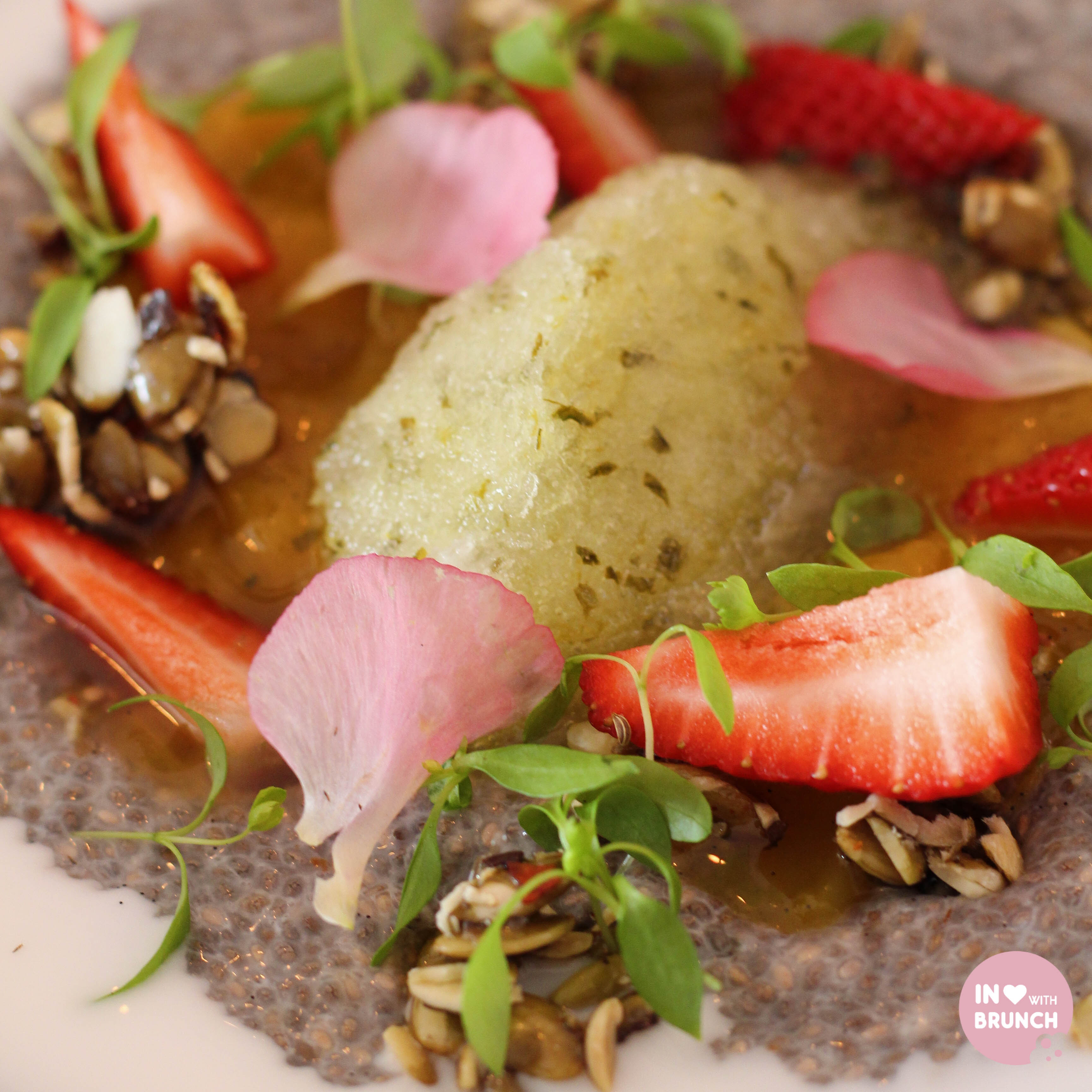 coconut chia pudding with strawberries, mint sorbet + candied chilli seeds