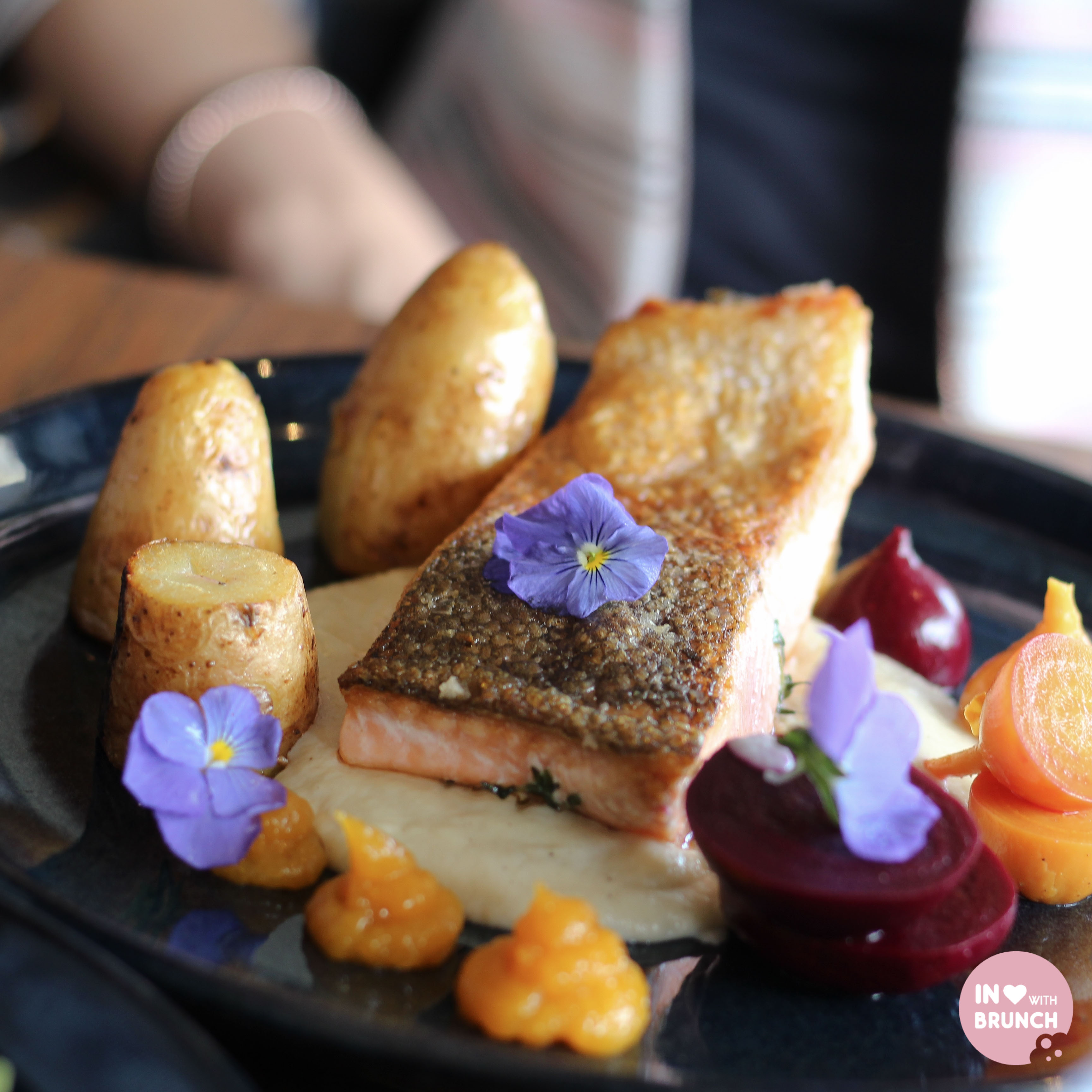 crispy-skinned ocean trout served with cauliflower puree, grilled kipfler potatoes, pickled baby beets and house made apricot conserve
