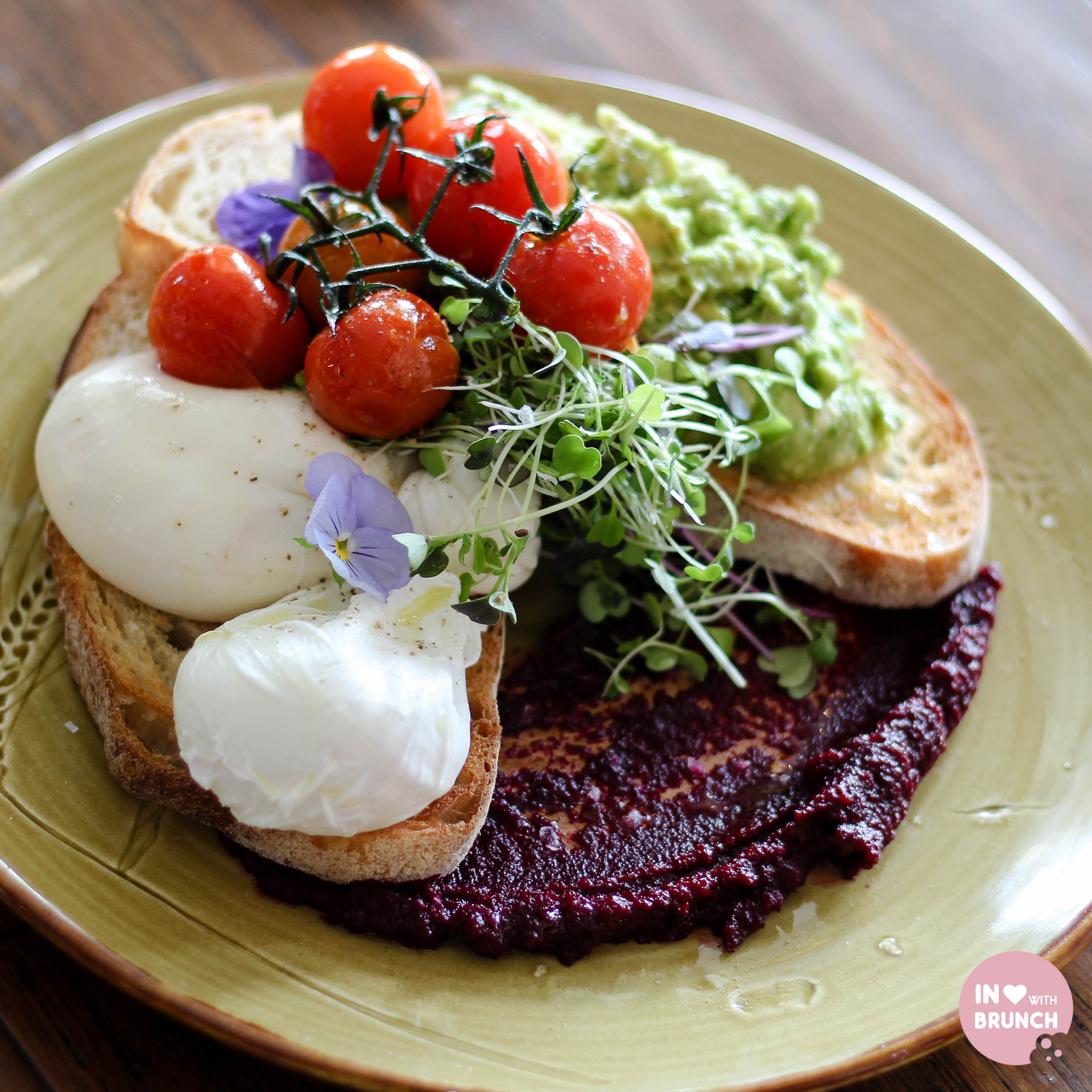 smashed avocado infused with lemon juice, cherry tomatoes, thyme and served on sourdough bread with italian burrata + beetroot puree