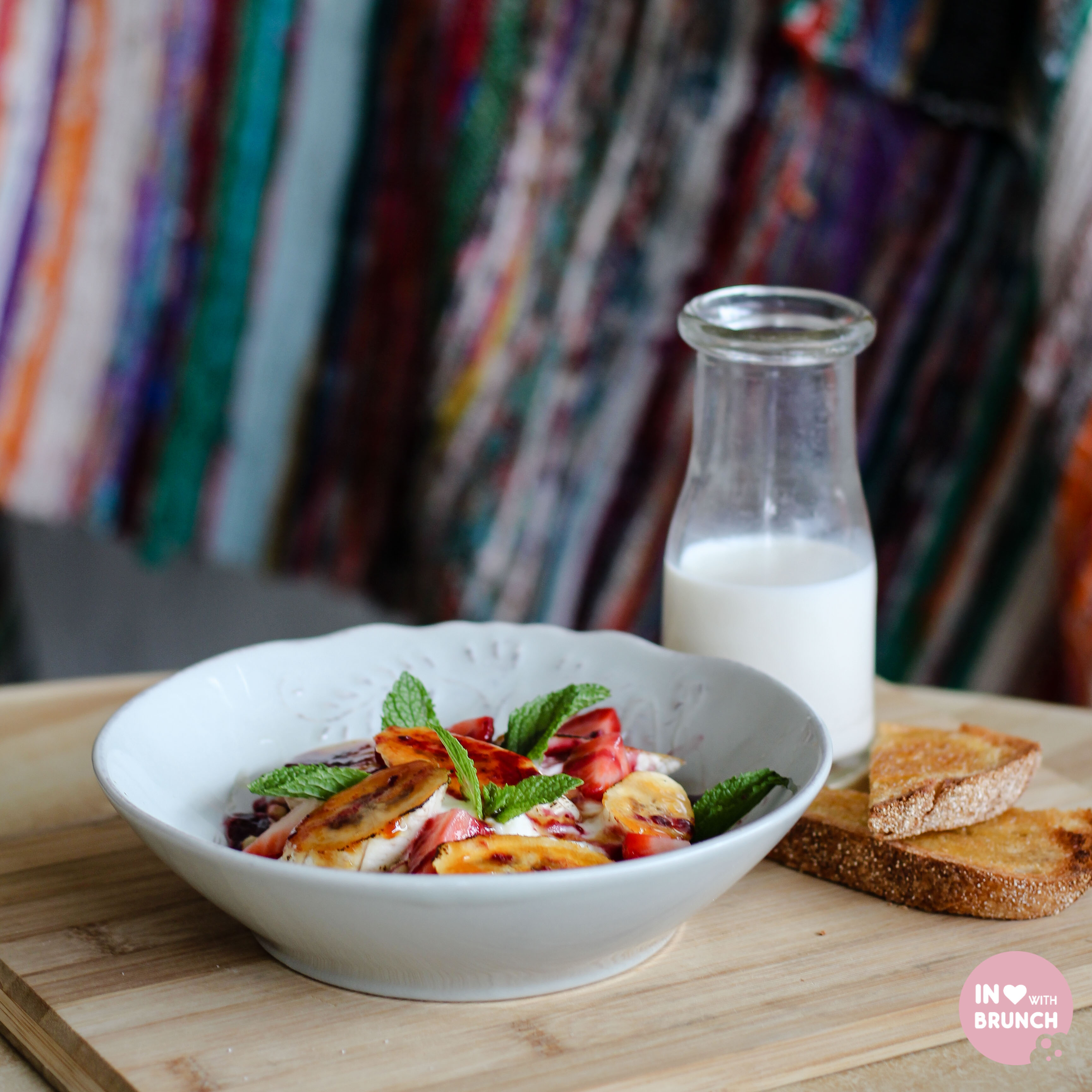 thessaloniki muesli: house boiled wheat with roasted almonds, walnuts, sesame seed, berry compote, sultanas, honey + banana brulee, served with house yoghurt and milk