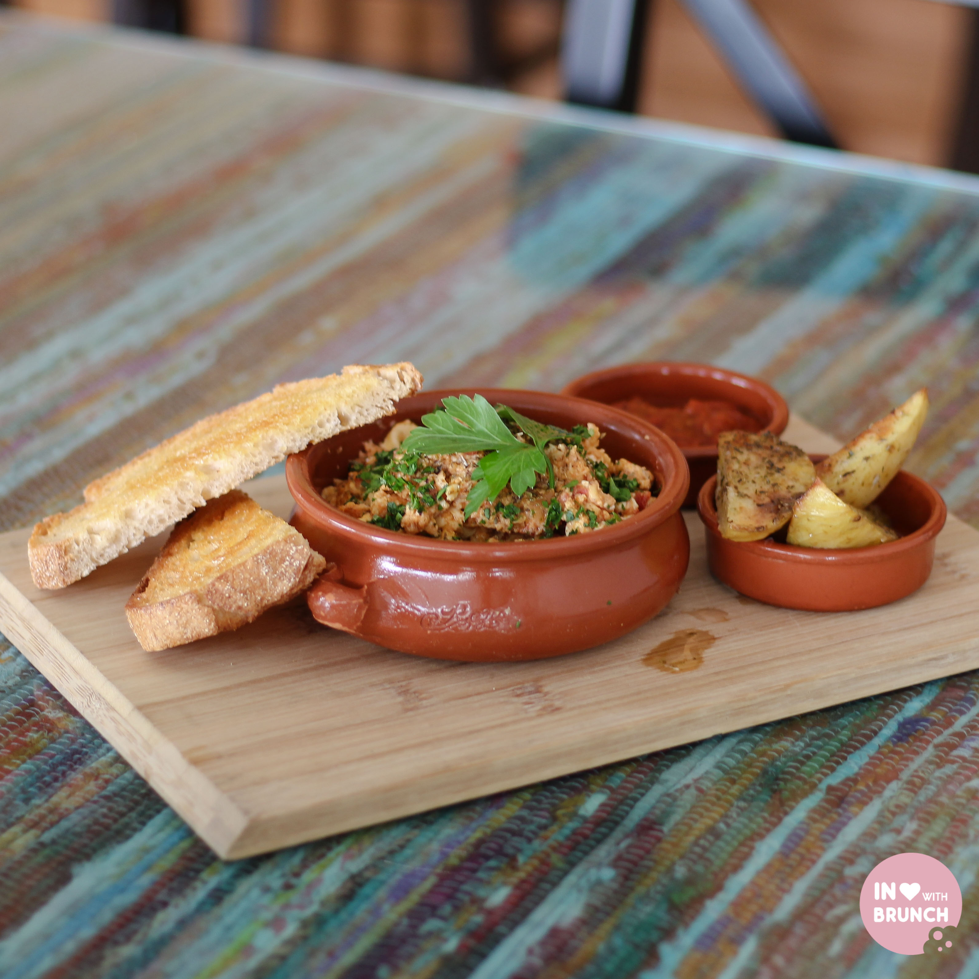 strapatsada: free range eggs scrambled with feta, tomato, confit onion, with roasted patates + sourdough