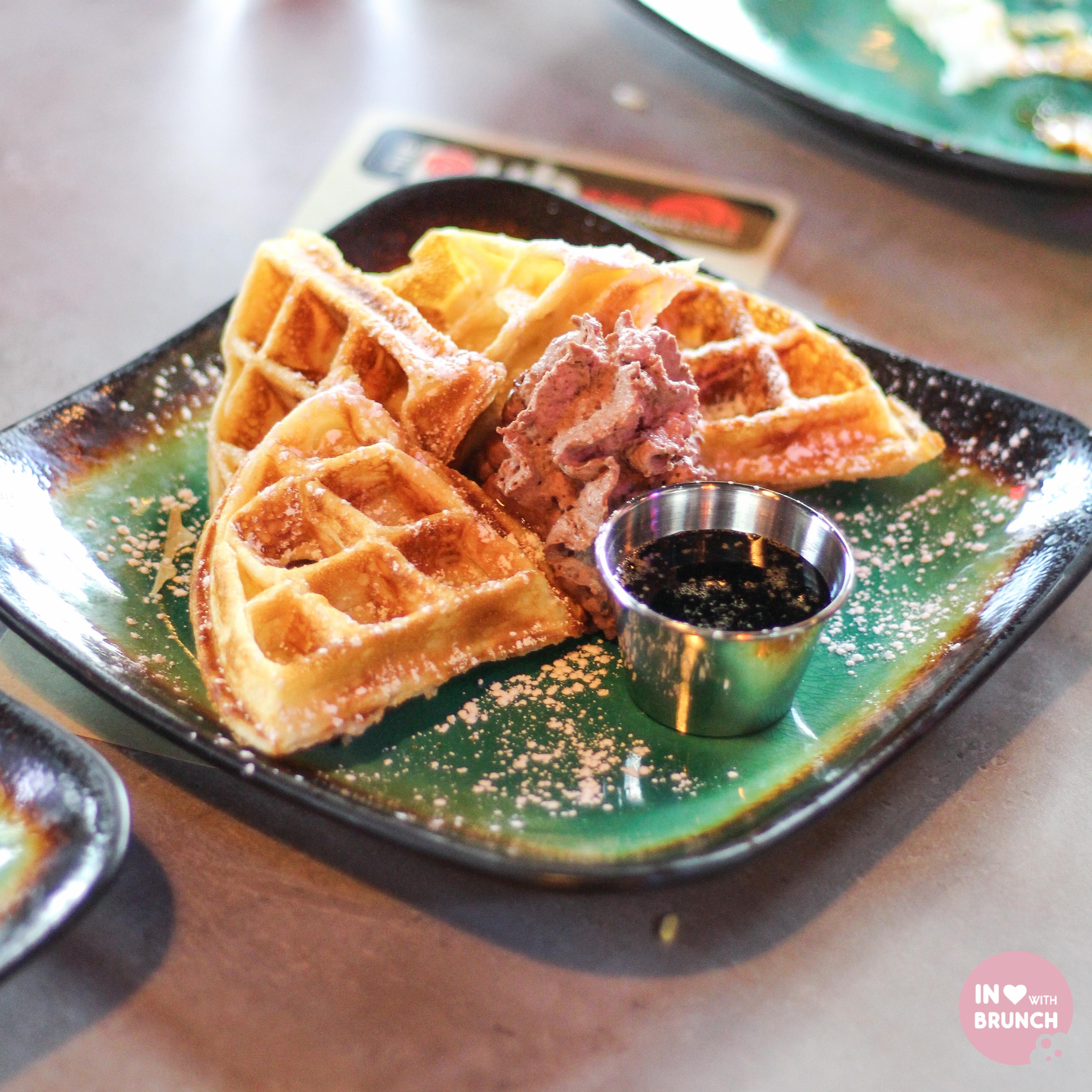 mayan waffles: waffles with maple and chilli syrup topped with fresh dark chocolate whipped cream