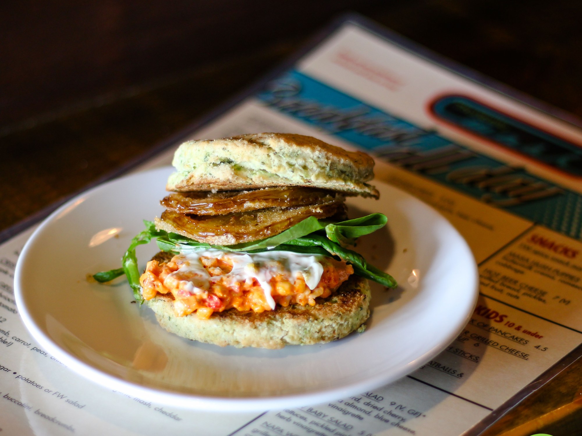 fried green biscuit sandwich: semolina-spinach biscuit with fried green tomato, fw pimento cheese + potato